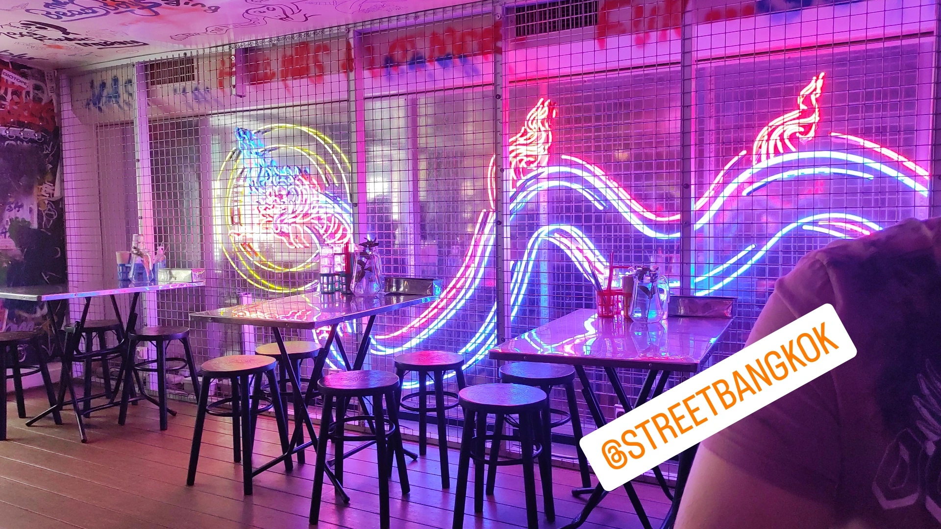 Bravo Street Bangkok: une ambiance urbaine branchée sympathique (graffs- néons- couverts dans une boîte en fer sur les tables façon cantine asiatique). Des plats simples mais terriblement goûteux et de très bons rapports qualité-prix. Mention spéciale pour le porc croustillant qui croustille vraiment et les woks! Autre mention spéciale pour Justine, jeune serveuse attentionnée et s'impliquant beaucoup dans son travail, à la joie de vivre communicative. Un petit mot gentil pour tout le monde et beaucoup d'empathie pour chaque personne.😊 Mon petit garçon vous dit merci Justine pour cette super limonade bien fraîche au gingembre! Pour plagier François Simon: Y retournerai-je? Évidemment! 💗💗💗