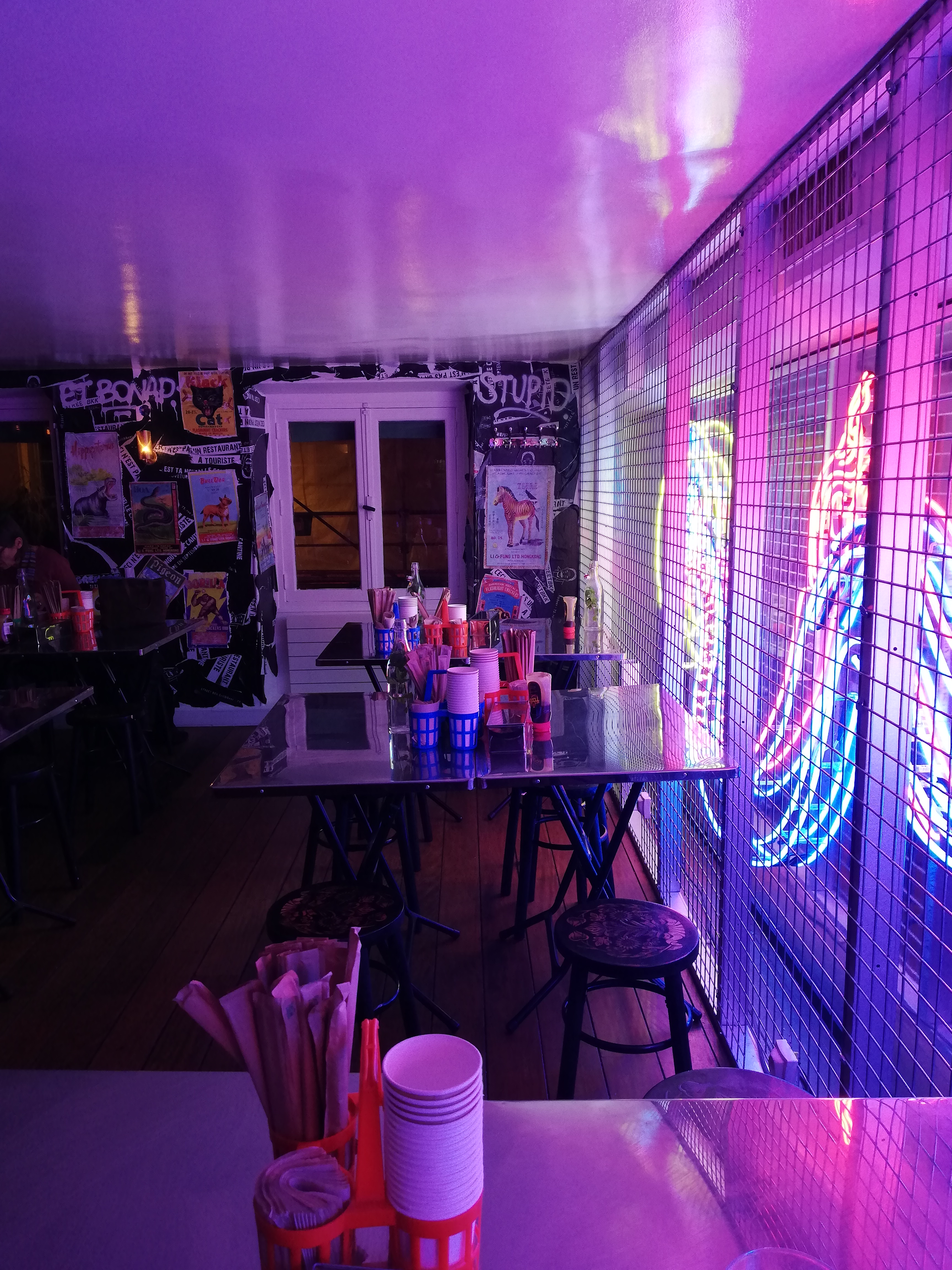 L’audace du lieu Le restaurant est très attirant, bariolé de néons et de collages originaux et les employés tiennent le rythme. Néanmoins, les plats – quoique relevés – peinent à atteindre une qualité idéale. Les plus : -L’entrée face aux cuisines ouvertes met dans le bain et rassure et l’étage coloré de néons et de collages-papiers atypiques et à la ventilation agréable finit de nous surprendre. -La qualité des ingrédients est indéniable, et lorsque l’on demande du piment en plus, il est très plaisant de se retrouver avec des vraies tranches de piments dans son plat et la bouche en feu. -Le service est charmant et attentionné. Et tous les employés portaient correctement leur masque ! Merci ! Les moins : -Les commandes se font via des bornes interactives, ce qui accélère sûrement le service mais met de la distance entre les clients et les employés ; de plus, ce n’est généralement pas propice à une hygiène tactile fantastique. -Les pad thaïs sont colorés et parfumés, mais le riz était bien trop cuit et l’impression de manger de la bouillie retirait de la saveur à la dégustation. -La propreté des toilettes n’était pas au top, même si dans l’univers de collage toute tâche devient relative. Le concept de cette street-good-food au marketing et à l’identité bien marqués en font une expérience variée et changeante. J’ai tout de même quelques difficultés face au côté trop « rue » et à la qualité mitigée de certains plats. Mais l’ambiance vaut le détour ou une nouvelle tentative.