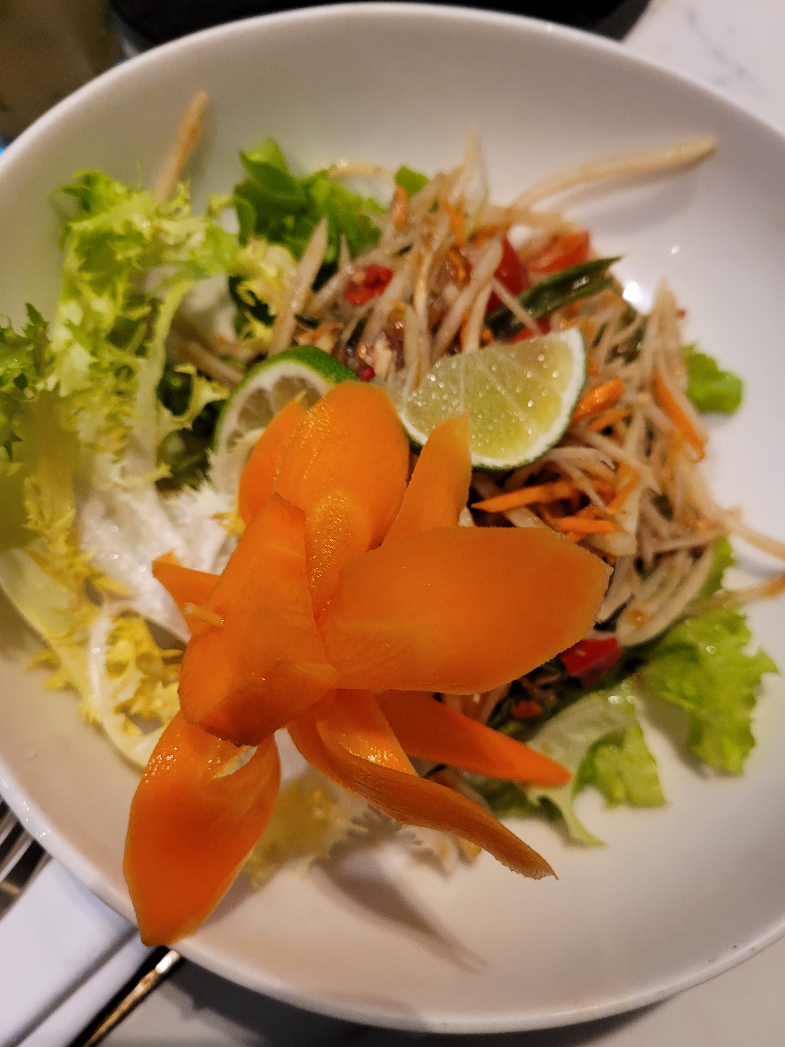 Super lieu chaleureux et convivial La salade au saumon et mangue verte délicieuse