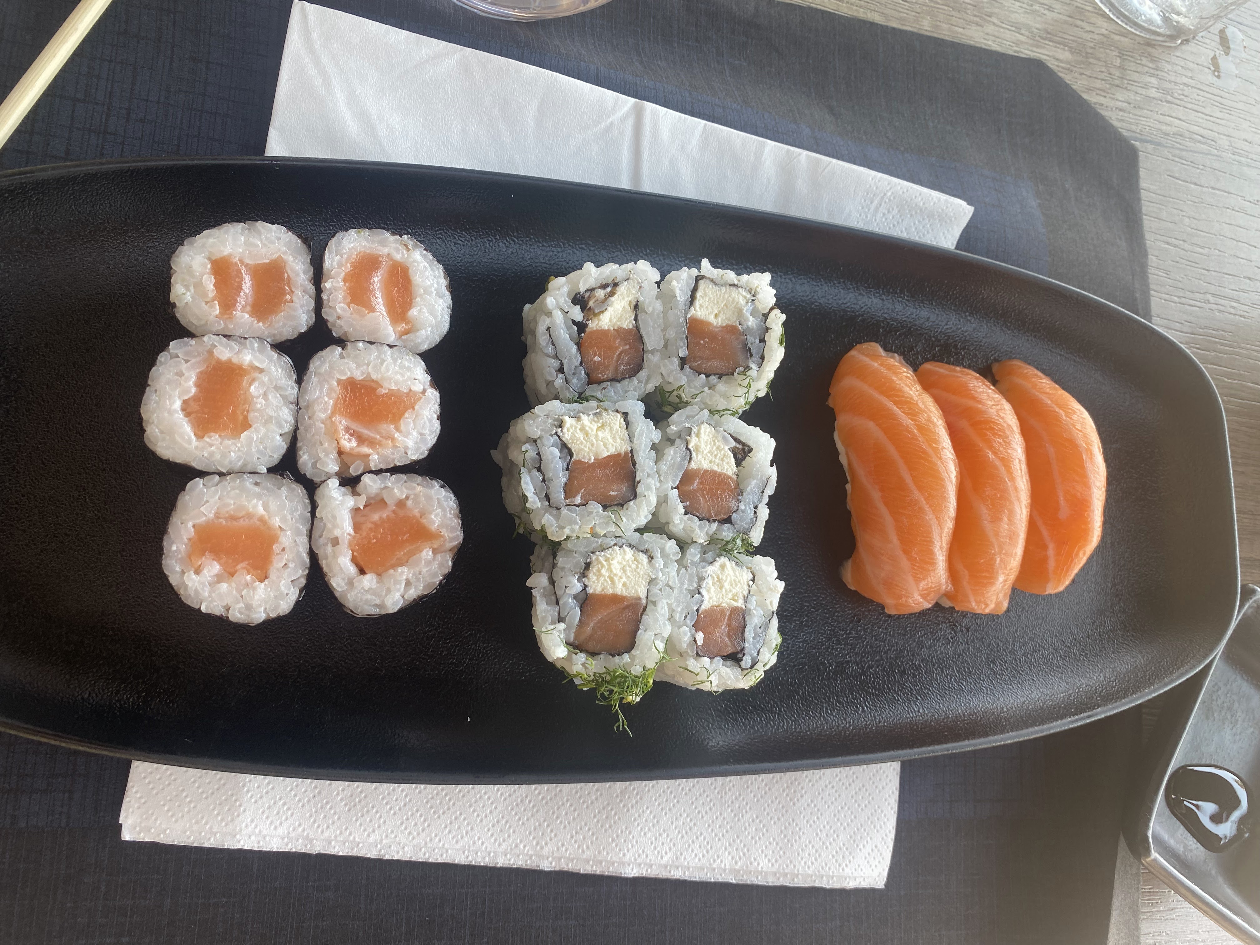 Bon restaurant dans l’ensemble ainsi que le service, il faudrait revoir les portions qui sont pour moi très petite pour le prix en l’occurrence les Maki chic à 9.50€ qui sont tout petits et n’ont aucun rapport avec la photo sur la carte!