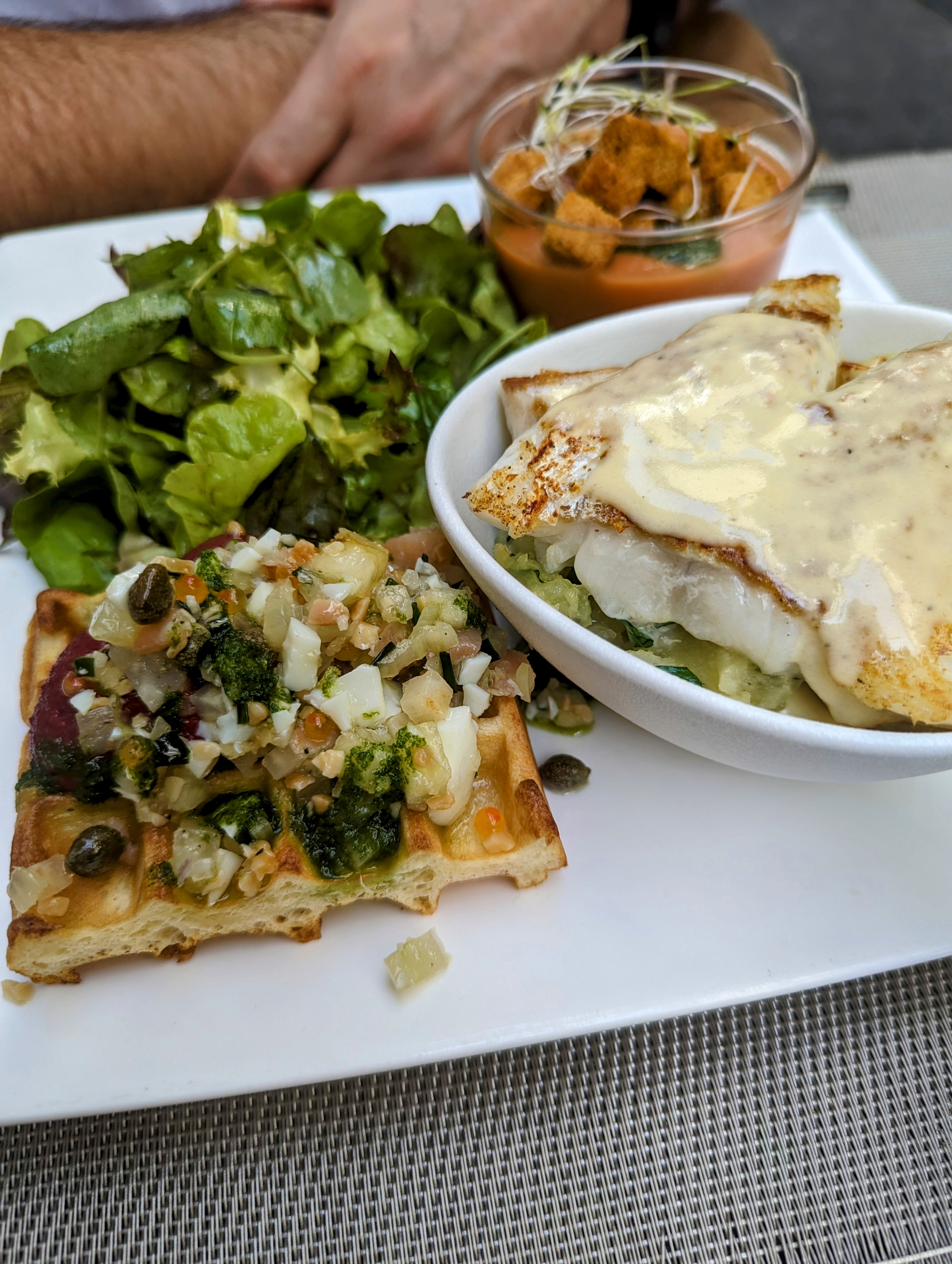Très belle assiette pleine de saveur et fraîcheur - serveur super agréable - nous avons déjeuné sur le trottoir - c’était calme mais nous n’avons pas pu apprécier la salle sympathique - une autre fois !