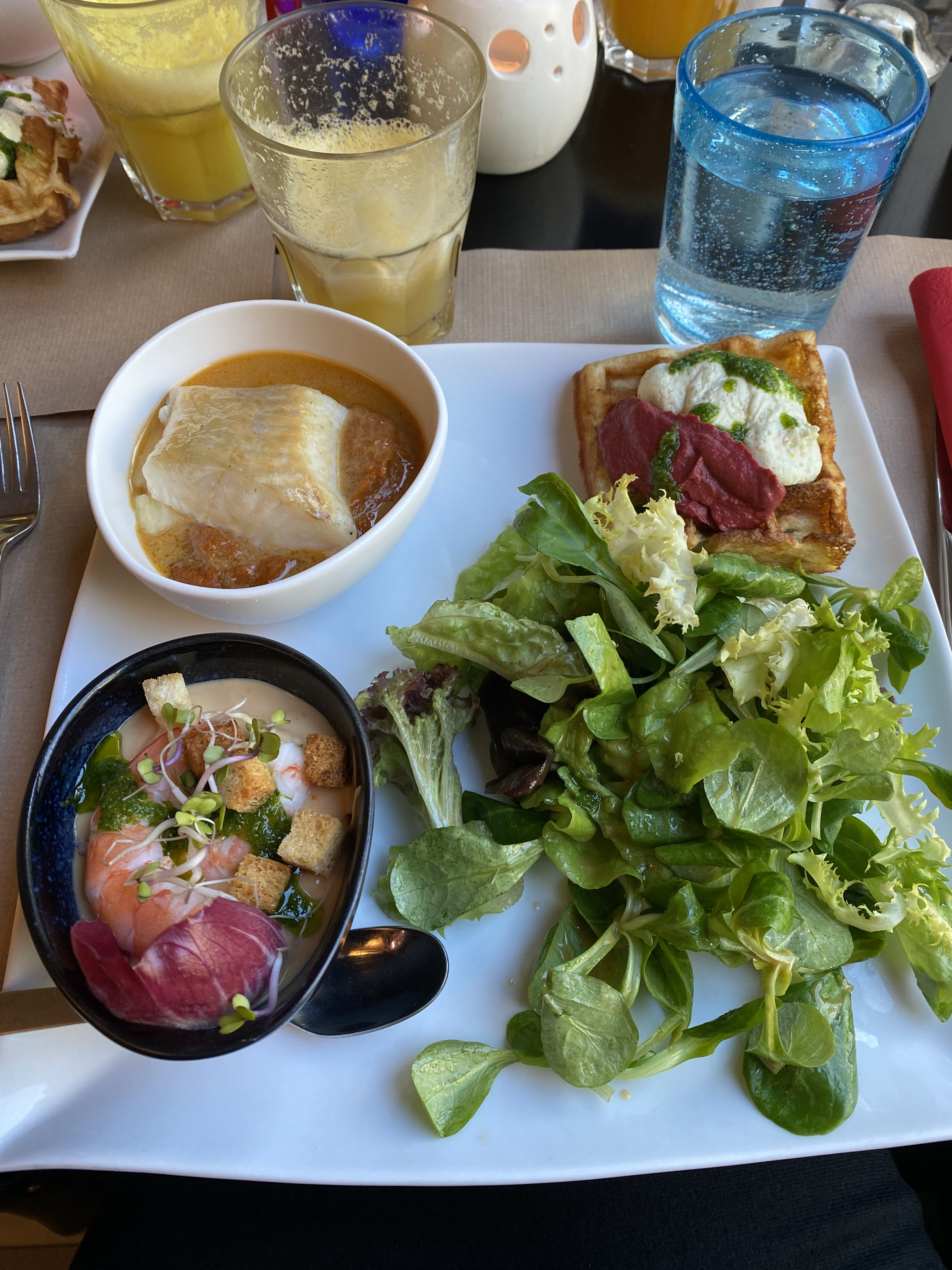 Nous avions 3 menus différents Saveur, Mer et Végétarien. Tout était fantastique. Saveurs, textures, surprennent tous les 5 étoiles. La présentation était excellente, pensez au plateau de classe affaires de la compagnie aérienne avec différents plats, tous valaient la peine d'attendre ! Desert Gourmand (3 plats différents) était exceptionnel et tellement bon marché à 8 euros. Le meilleur café noisette que nous ayons eu en France