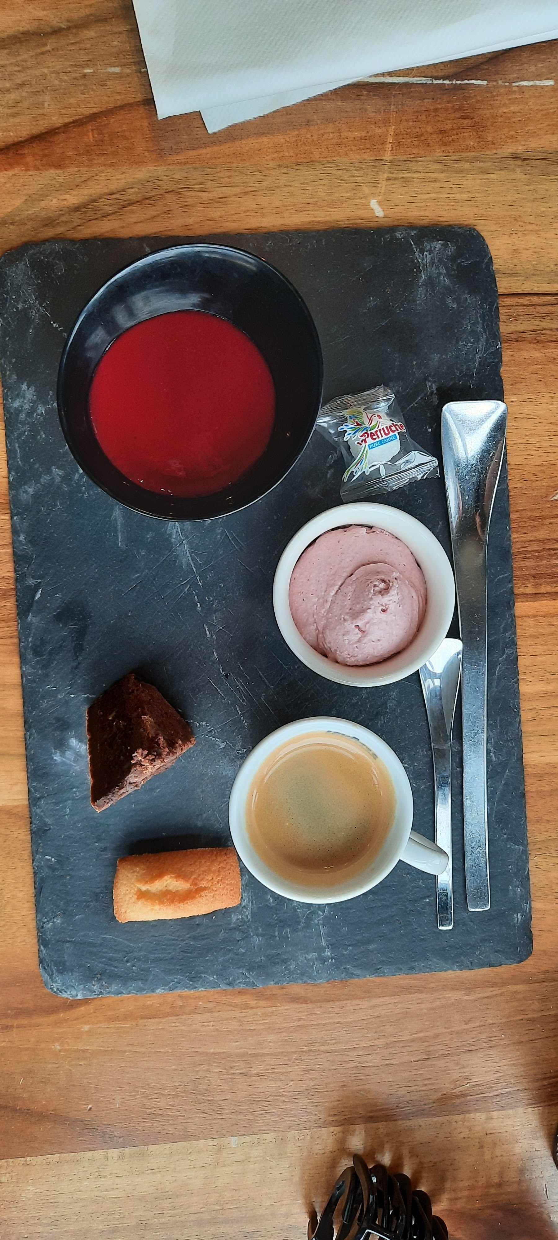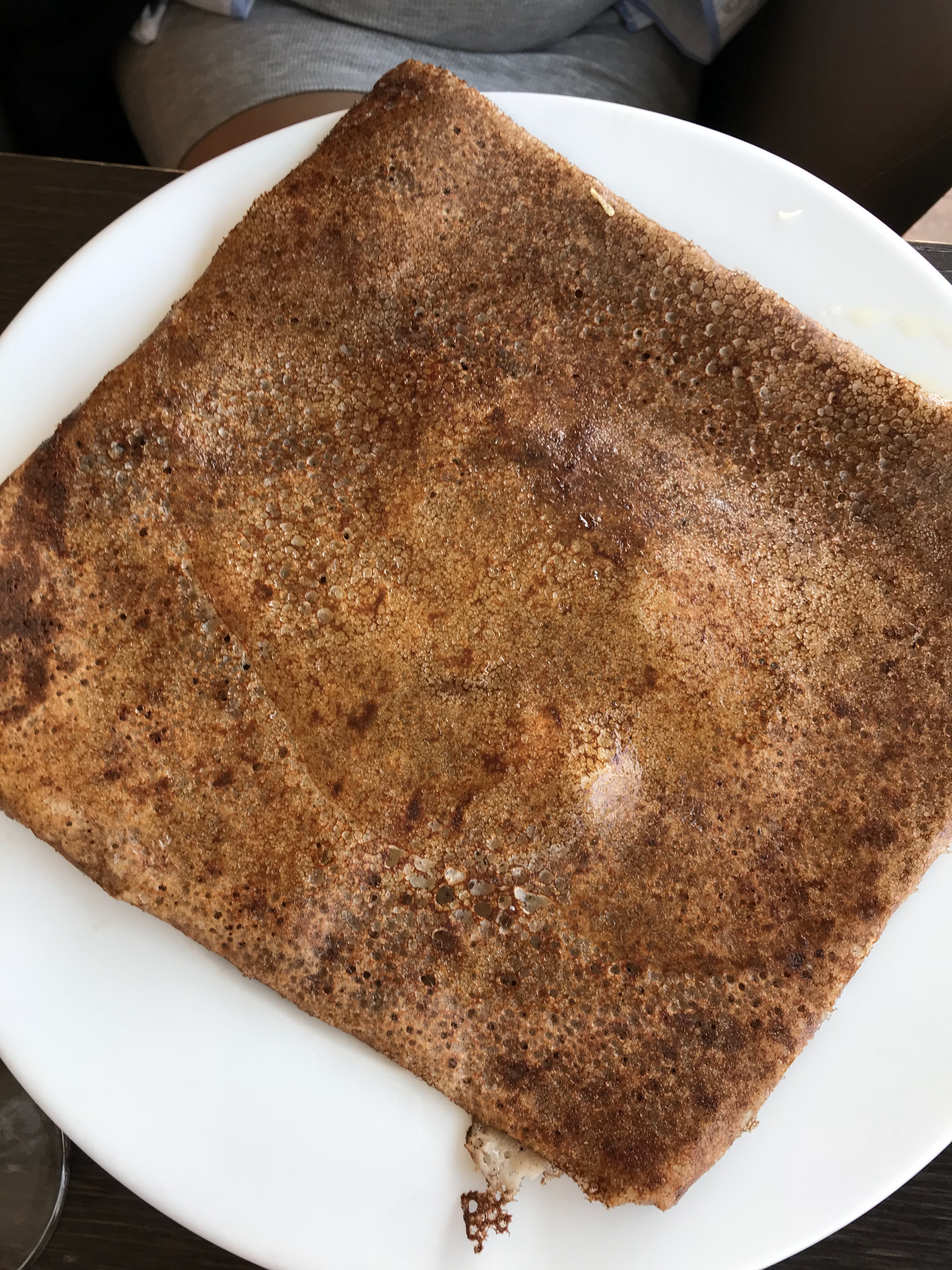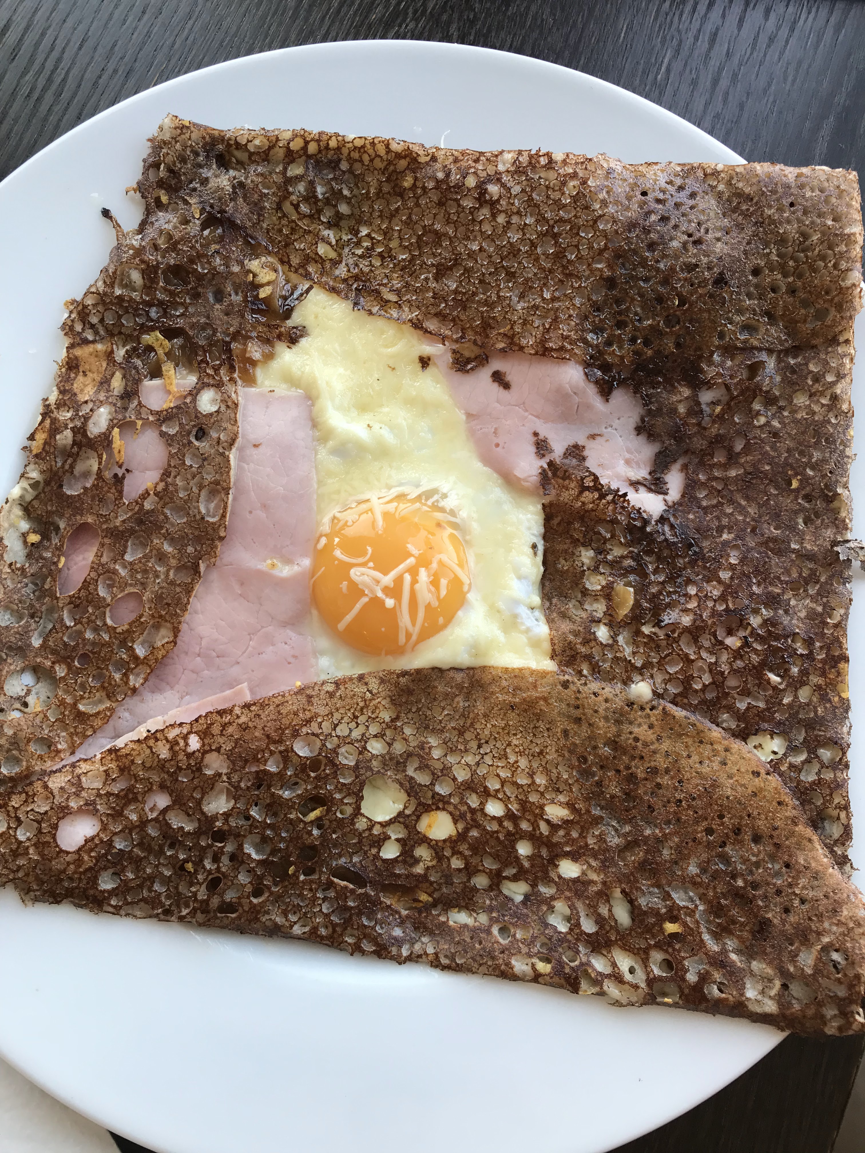 Ma nourriture était correcte, la galette commandée par ma femme avait un goût étrange. Pas d’une manière malsaine ou gâtée, sûrement pas. Juste un goût que nous ne trouvons pas dans les œufs, le jambon et le fromage et que nous n’aimons pas.