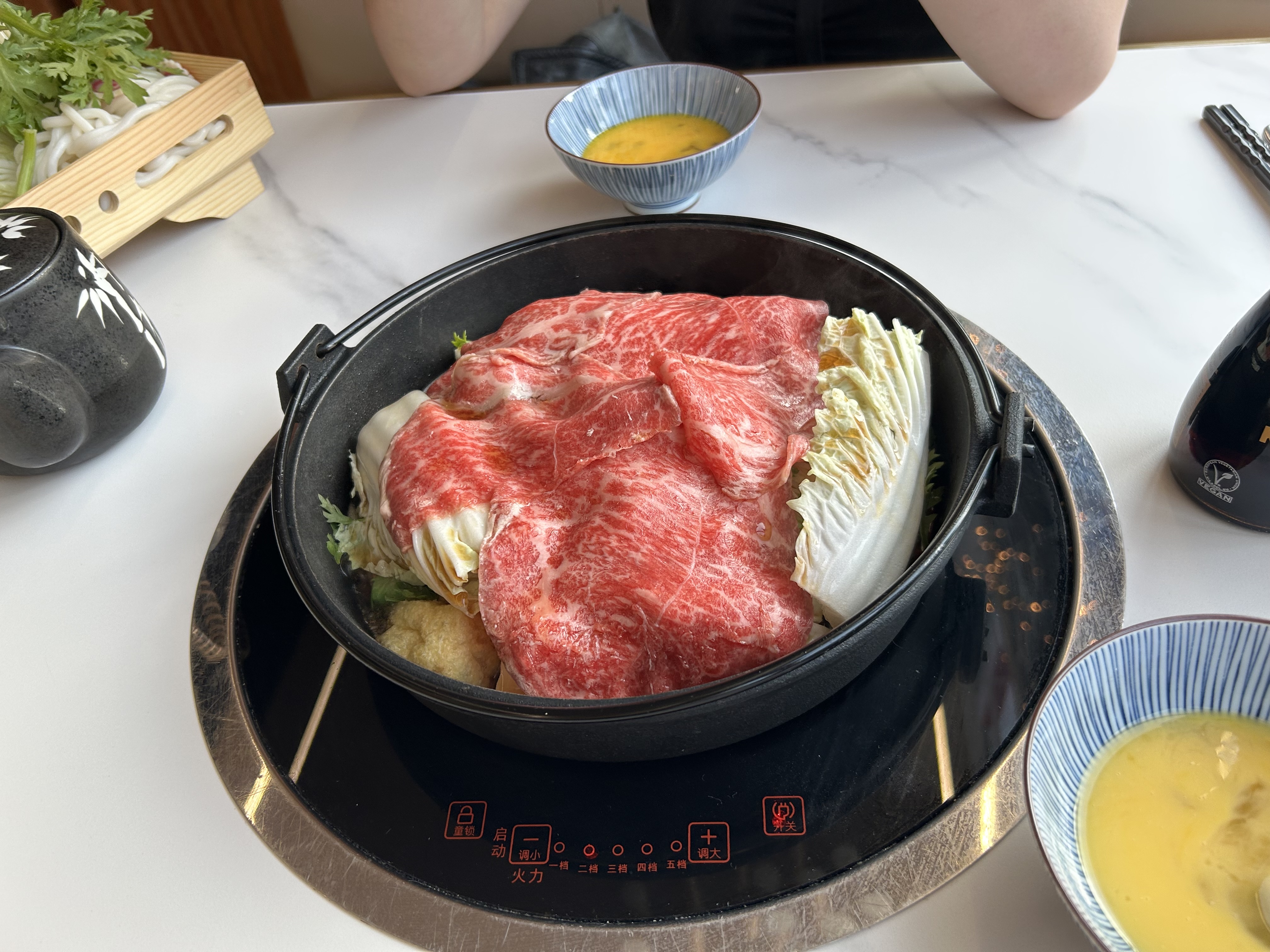 Je n'avais jamais de fondue japonaise, c'était l'occasion. C'était une bonne expérience pour nous, il y avait beaucoup de viande et de légumes, mais je n'ai pas trouvé le bouillon assez savoureux. Le service était au top avec nous, nous avons eu le droit à des makis et sashimi offert en entrée. L'ambiance est bonne, la déco est moderne, beaucoup d'espace et très éclairée. Néanmoins le prix reste élevé pour un sukiyaki bœuf, compté 80 euros pour deux à plusieurs personnes.