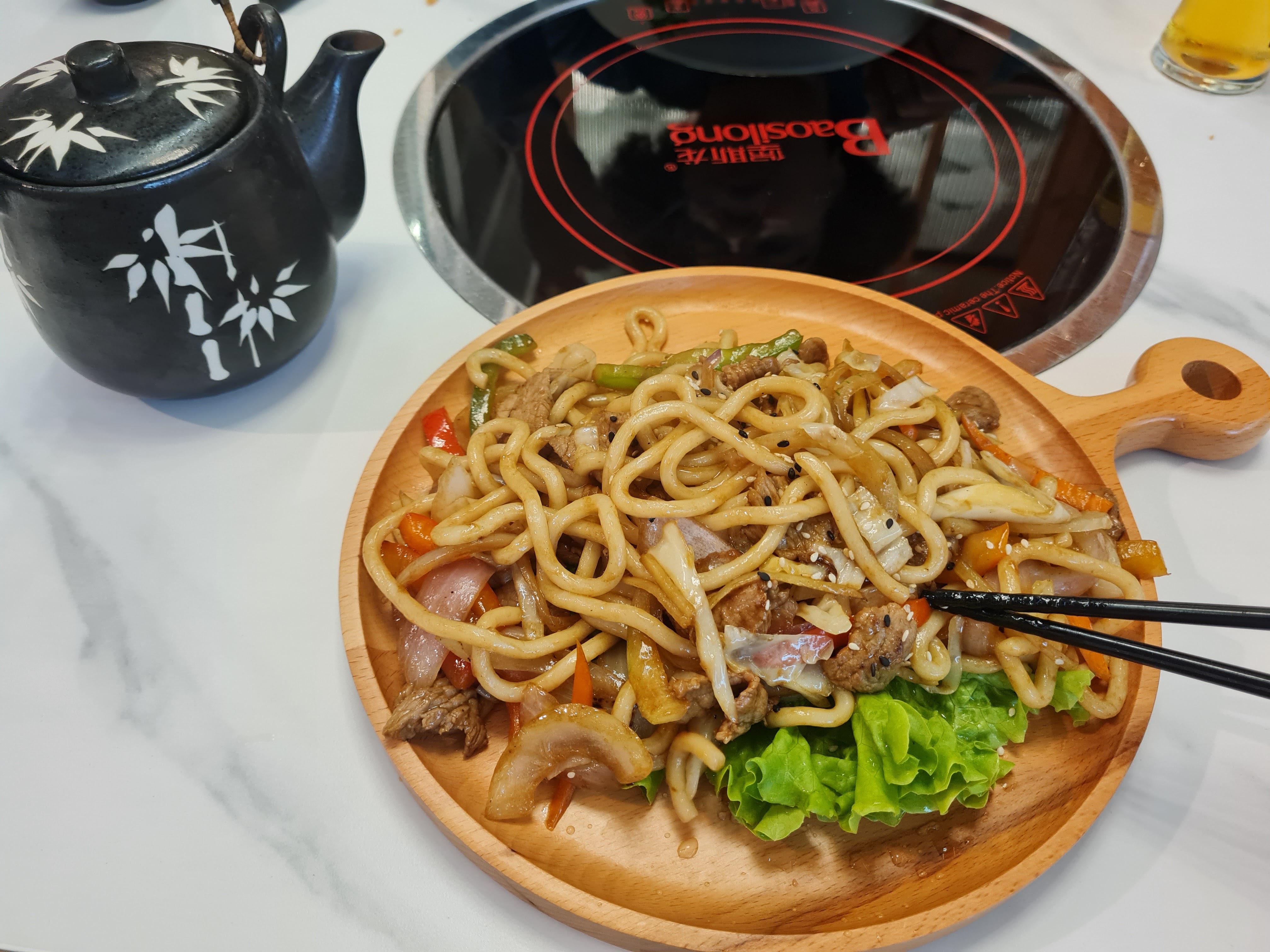 Viande servi froide,mal assaisonnée, pas assez cuite et non tranchée avec des simples baguettes.
