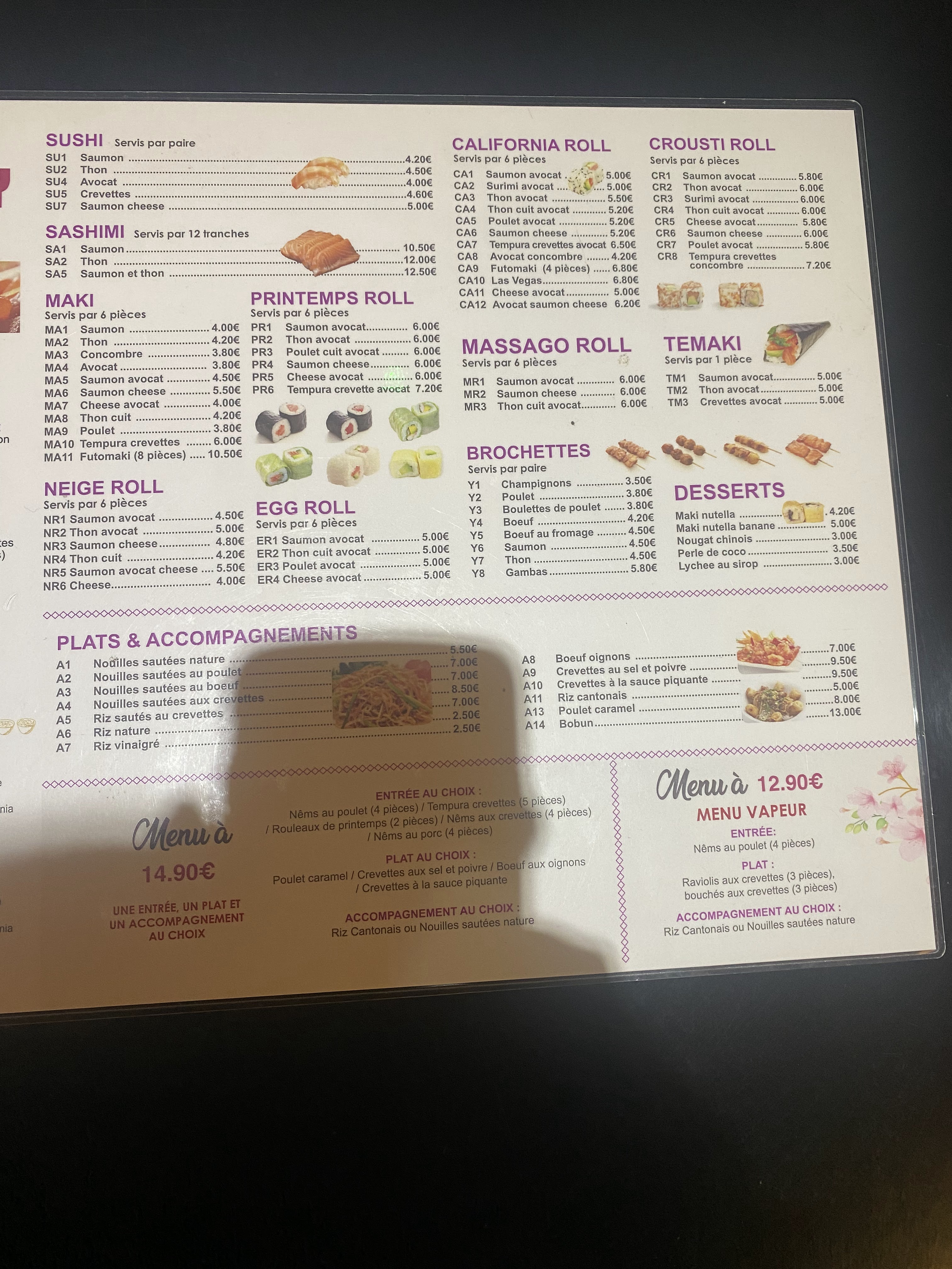 C'est un excellent buffet à volonté. On y trouve des plats chauds raviolis frits, à la vapeur, nems, salade, soupe, brochettes... mais aussi des sushi, maki, california roll et parfois temaki ! Très très bon rapport qualité prix. Y'a rien de mieux quand on étudie à coté ;)