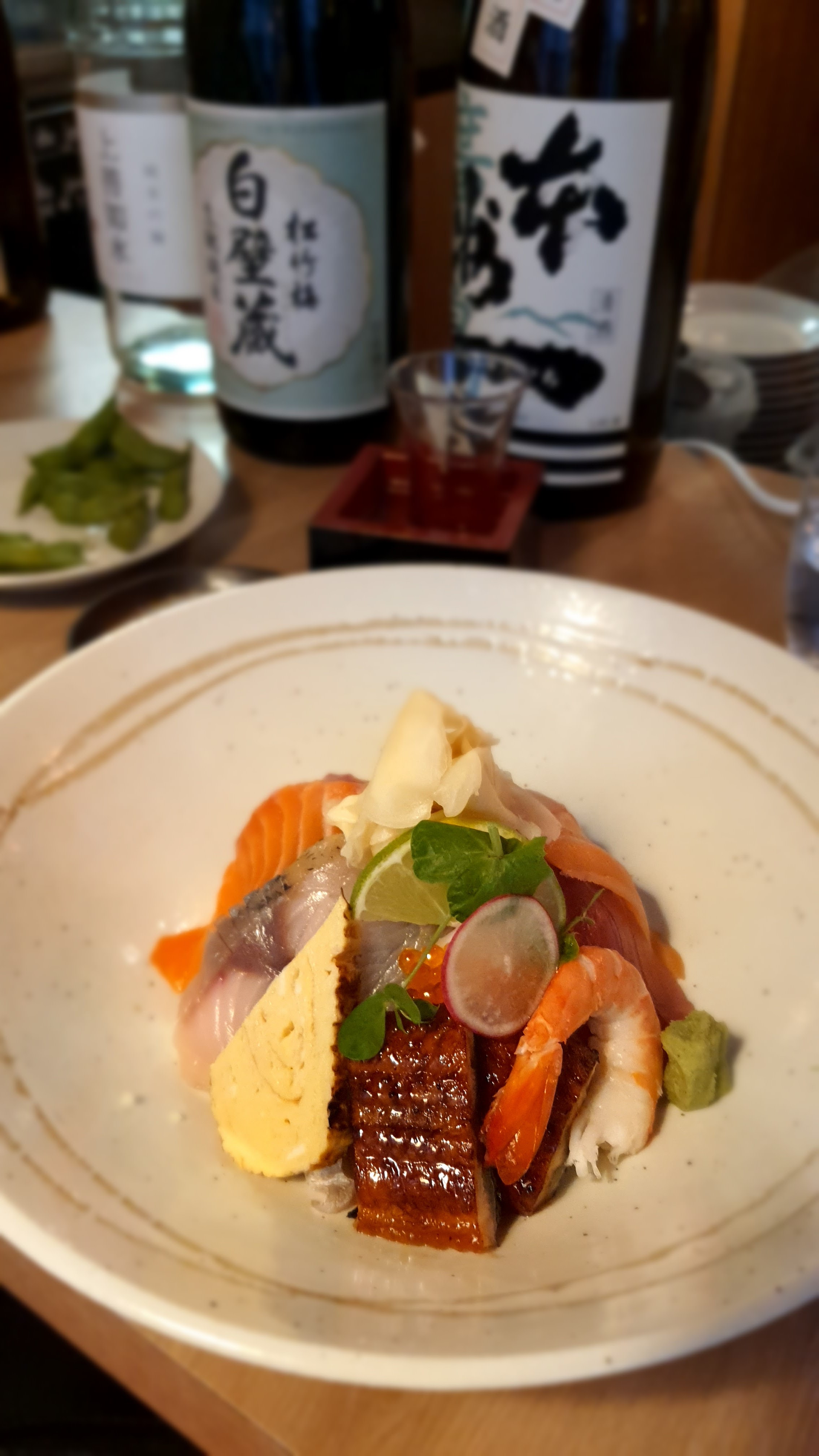 Restaurant japonais dans Paris 9ème. Diverses choses de la carte, un véritable festival de délicatesse. Foie de lotte sauce Ponzu, Carpaccio de bar, langue de bœuf et filet de canard, on enchaîne sans problème, le goût est là, on adore ! Le tout est accompagné d’un saké, qu’on nous sert dans un verre lui-même dans un bac à débordement en bois, digne d'un rituel. On y retournera sans hésiter !
