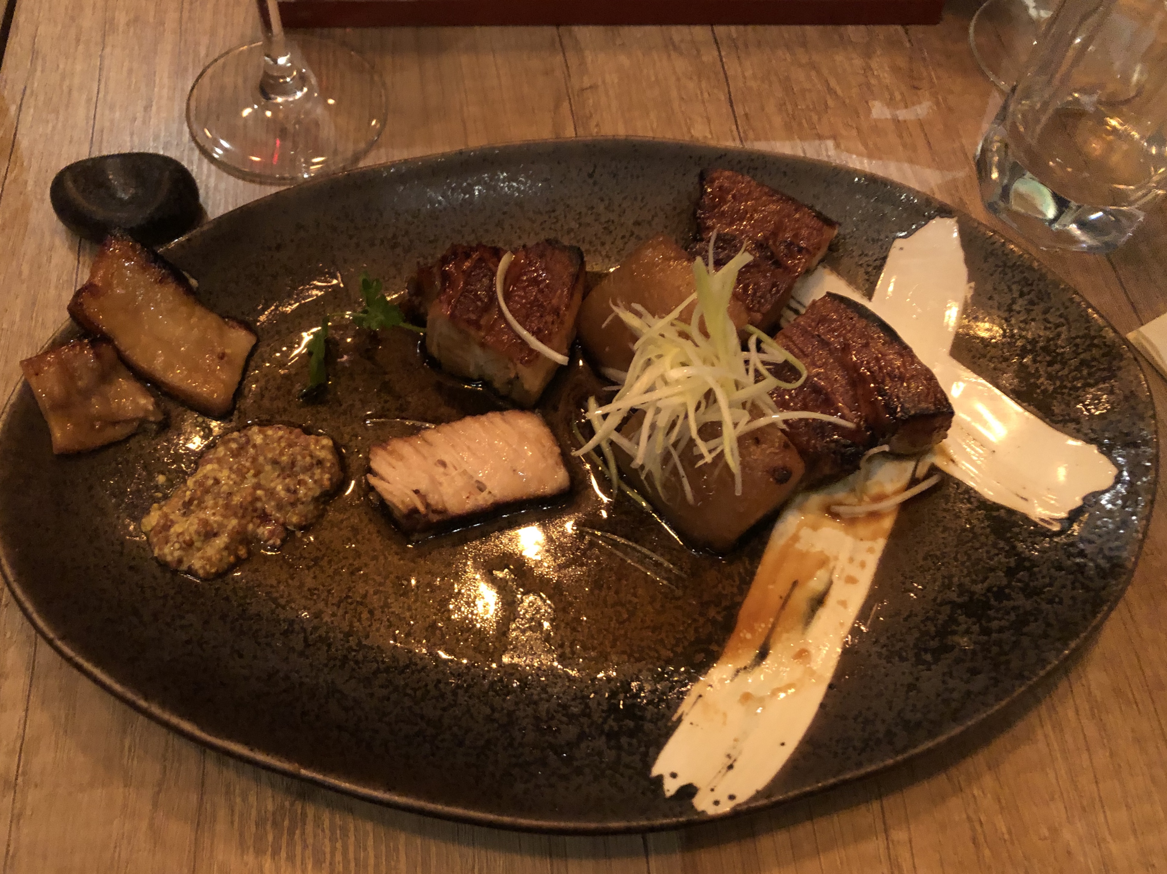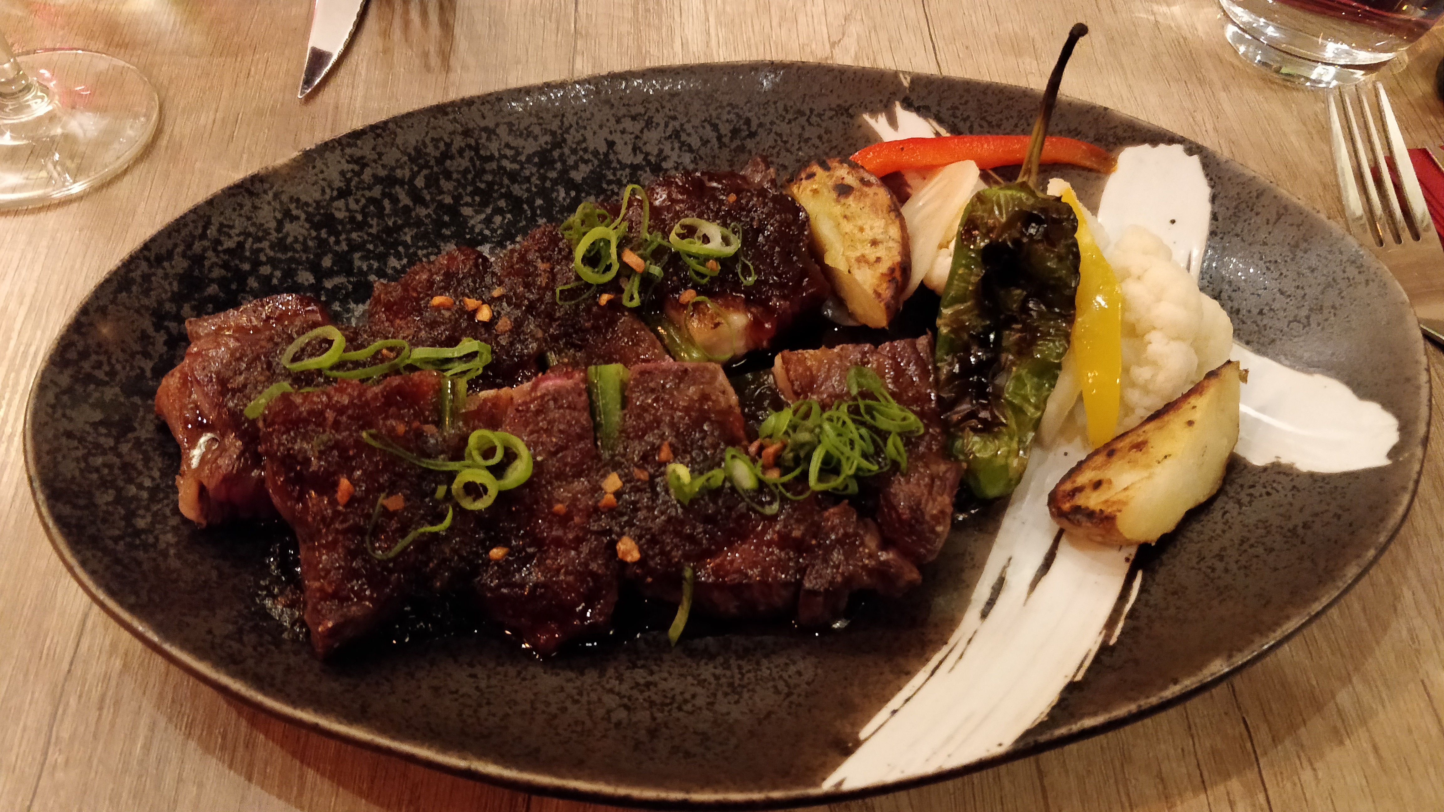 Décevant compte tenu de la note. Bonnes saucisses, très bon poulet croustillant, faux-filet usé et la sauce était épaisse et pas particulièrement agréable. La nourriture était savoureuse mais ni subtile ni raffinée. J'avais le deuxième vin rouge le plus cher, un Bourgogne, mais ce n'était pas très bon, niveau vin maison avec une majoration estimée à 3x à 4x. Peut-être que les sushis et sashimis sont meilleurs mais ce n'est pas pour ça que je suis venu.