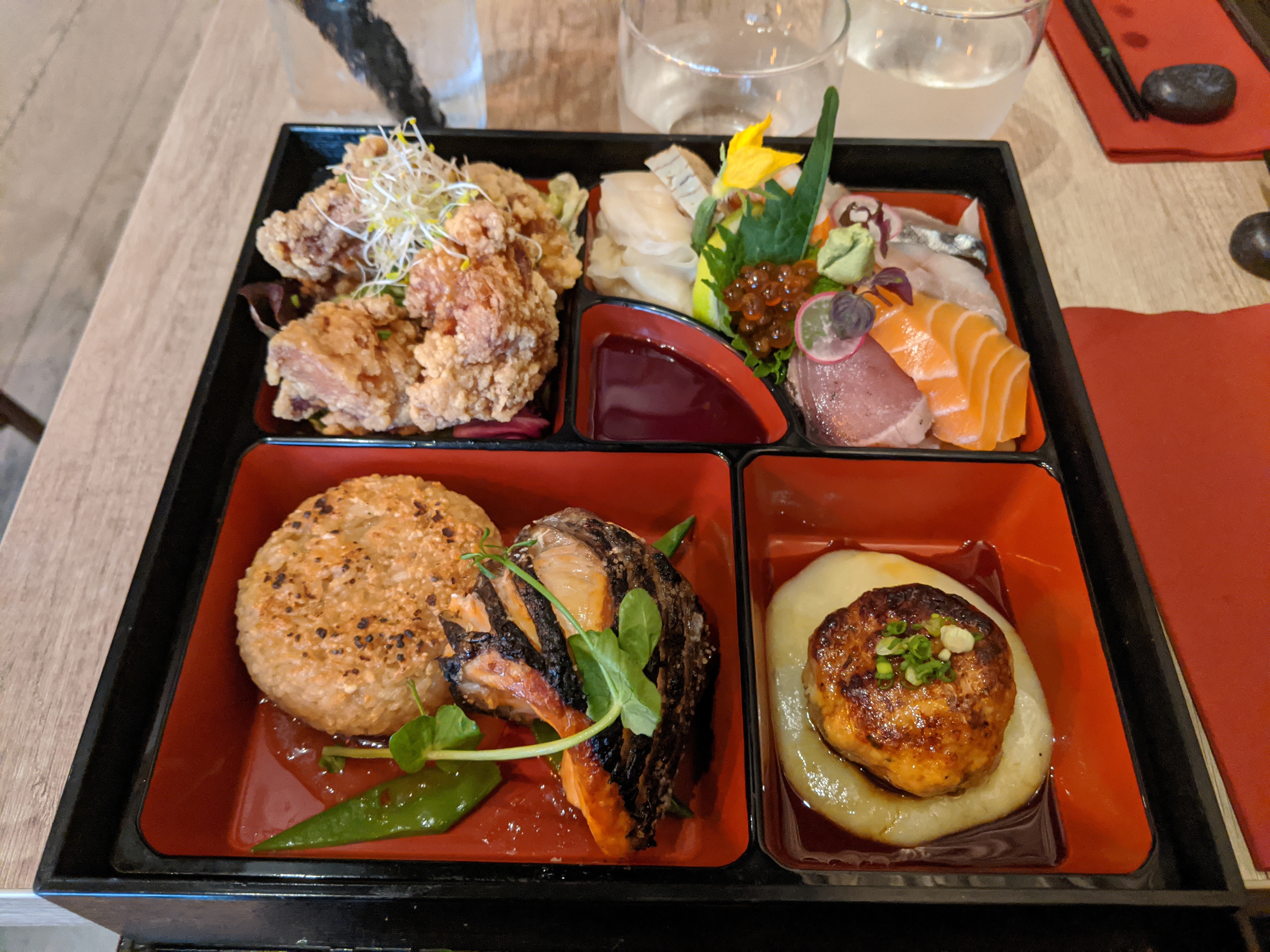 Je ne sais vraiment pas pourquoi le restaurant a des critiques élogieuses - la boîte à bento que j'avais pour le déjeuner était trop chère pour la taille des portions. Le poisson n'était pas frais non plus.