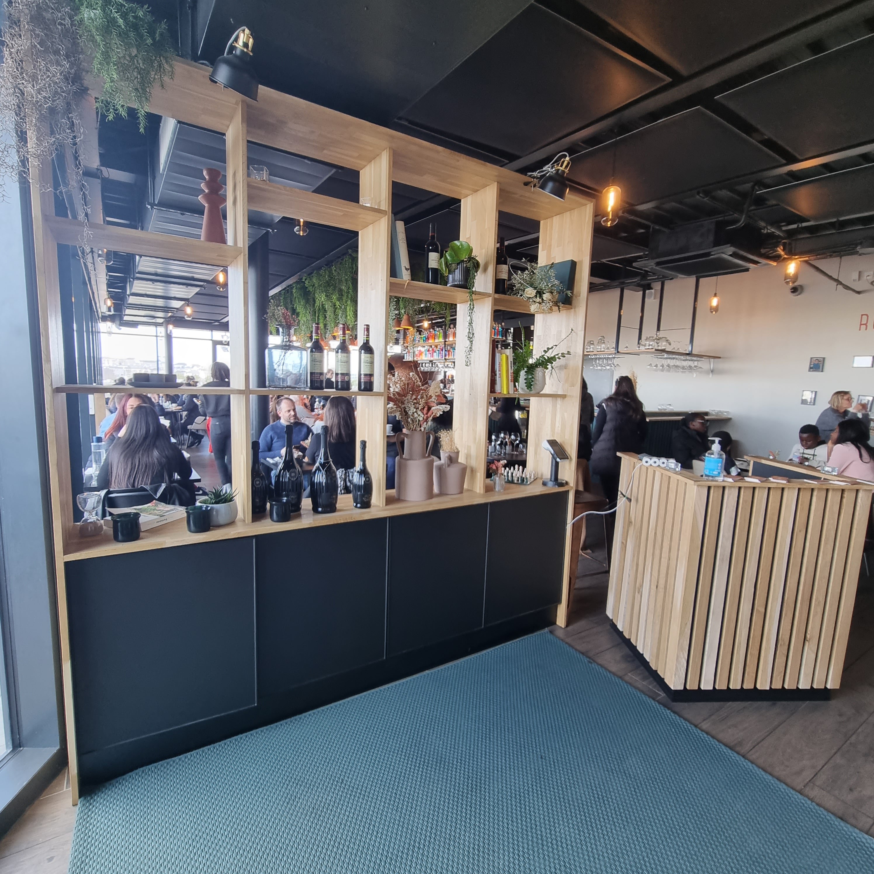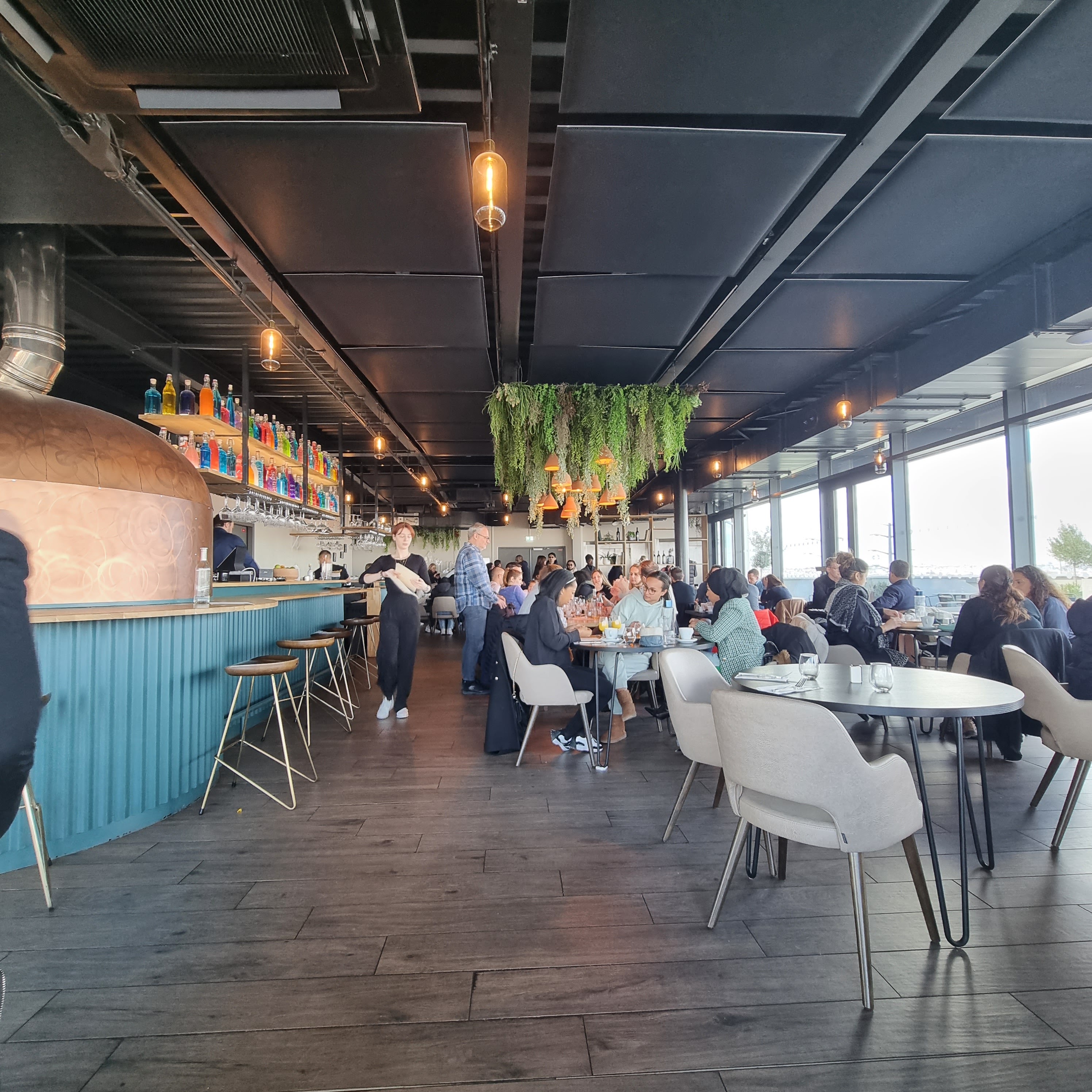 Lieu incroyable. Beau restaurant en rooftop. Personnele agréable, mention spéciale pour l'hôtesse d'accueil très gentille et disponible. Espace extérieur aménagé style cosy coloré et intérieur très épuré avec des touches d'originalité avec les bouteilles colorés en décoration. Les repas sont bons notamment les pizzas et les cocktails aussi. Grand parking gratuit disponible.