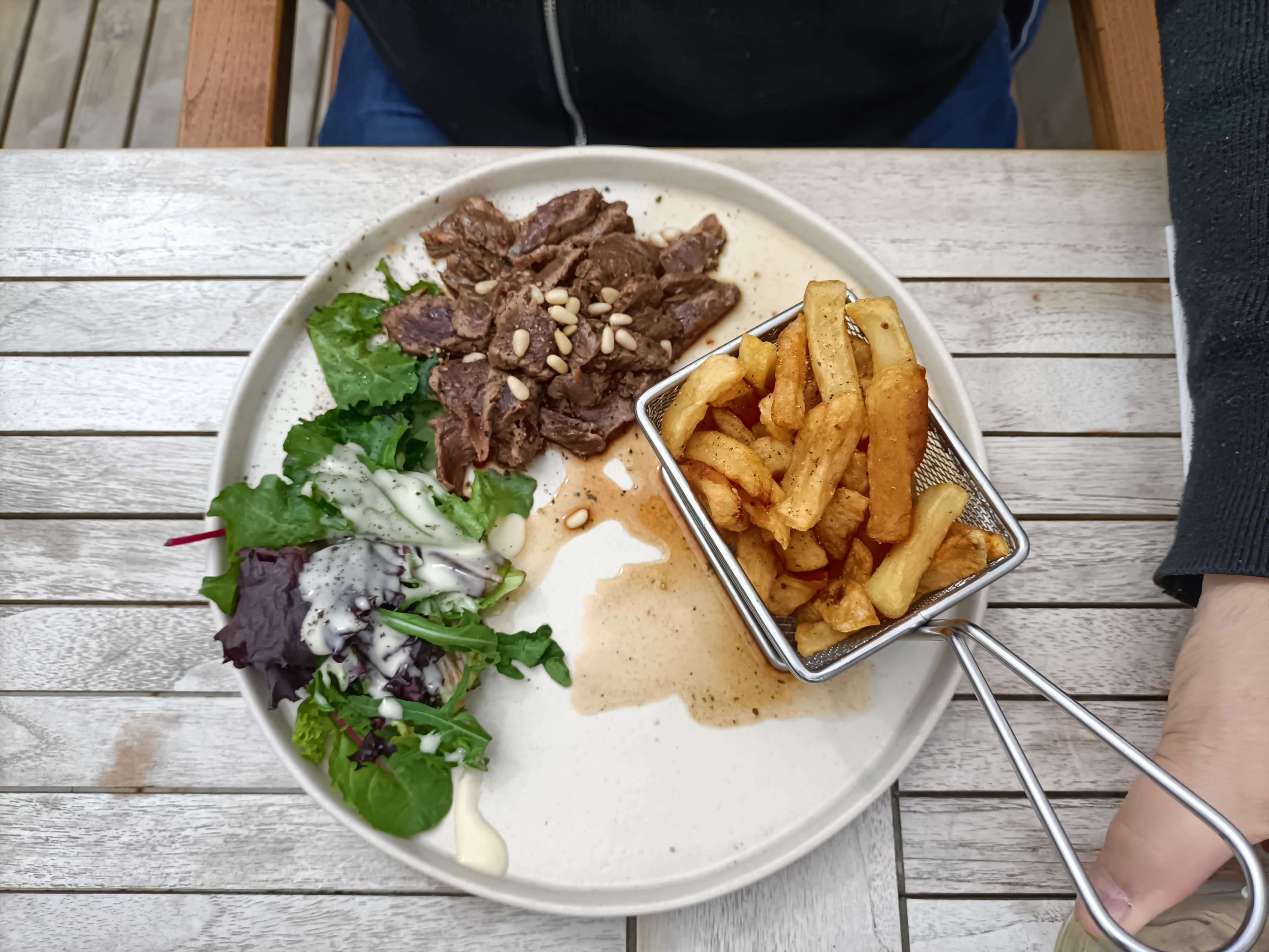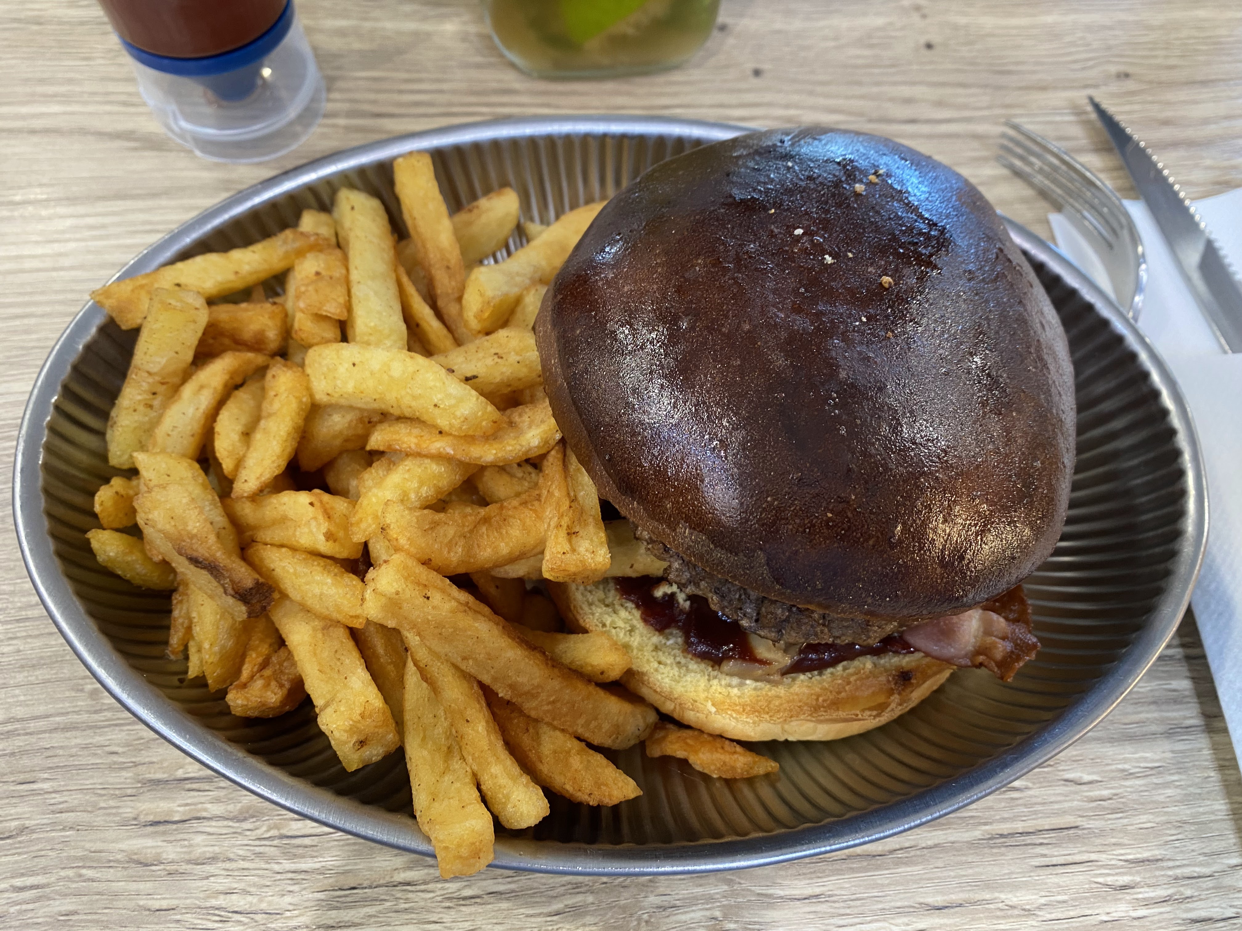 Les frites étaient sèches recuites et le steak haché pas top le temps d attente interminable et le dessert pas la même dose de glace par personne . Faire des kms pour venir merci j irai ailleurs