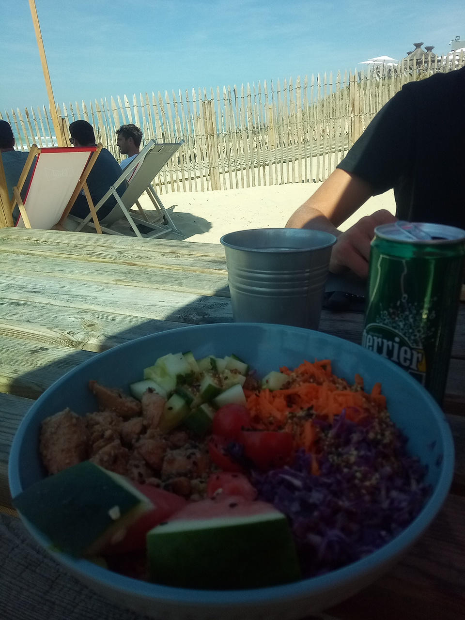 Super emplacement, très belle vue sur l'océan, tout en mangeant une salade les pieds dans le sable ! Un peu déçue cependant quant au service, d'abord la serveuse qui se présente comme la carte pour ne pas déplacer les grandes ardoises, qui nous presse pour la commande et enfin ma salade bouddha tant attendue, le quinoa pas assez cuit, les crudités ne sont pas froids et le tout dans un grand bol saladier plastique alors que toutes les autres tables (je le vois à la fin du repas) bénéficient de grands bols japonais ... Bon, c'était un bon moment quand même !
