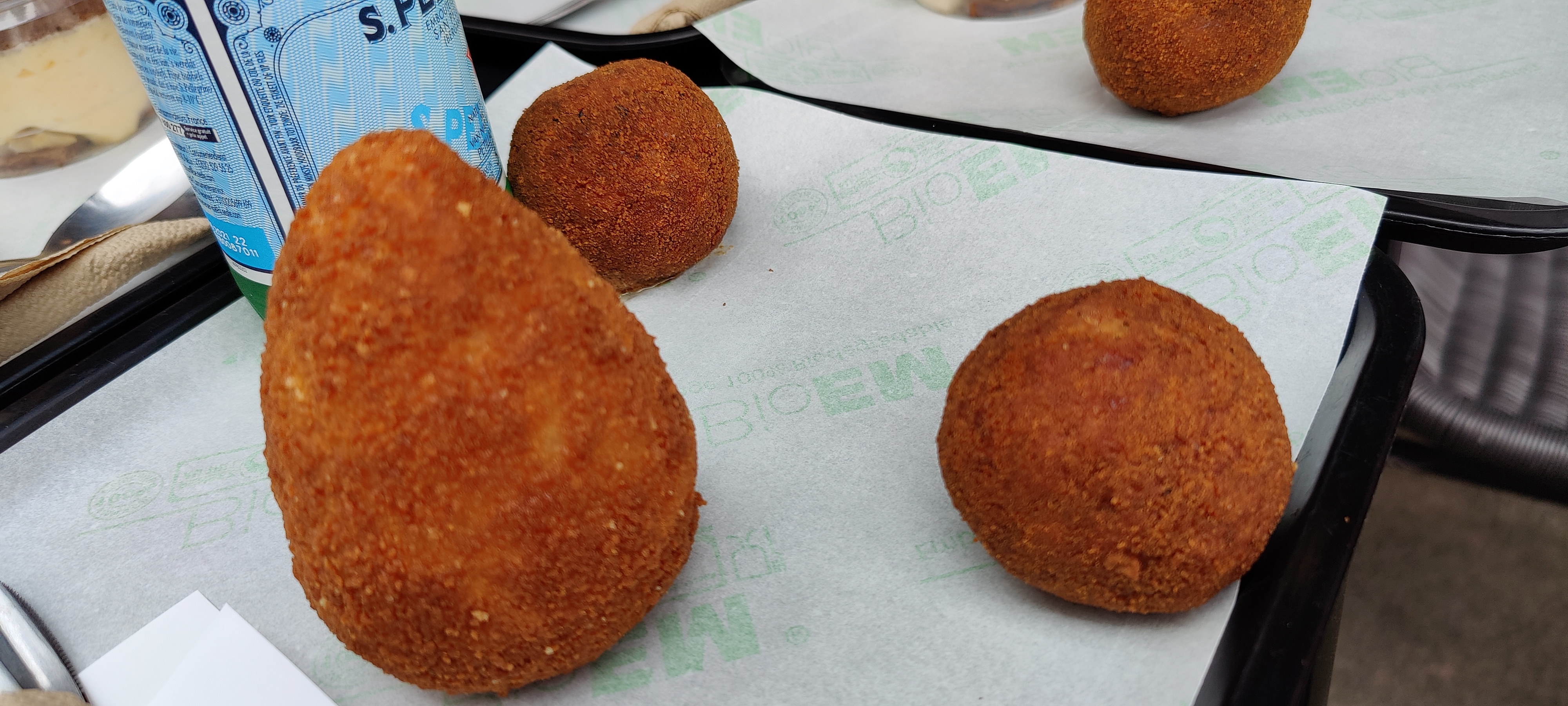 Très bonne découverte de cette spécialité Italienne : boules de riz fris avec de la mozza, viande, etc... Une tuerie !
