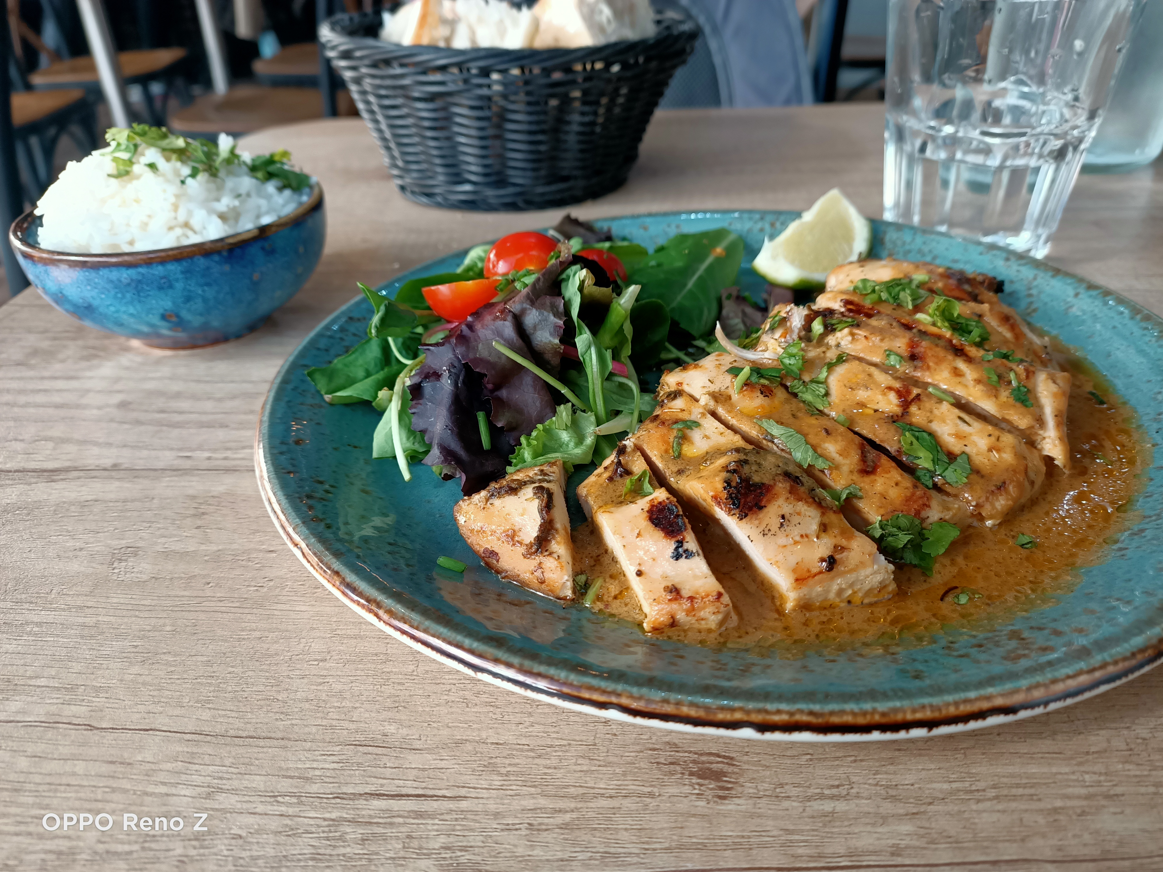 La nourriture est délicieuse et les portions sont très copieuses. Les salades sont originales, le fameux poulet braise vaut le détour, et le personnel est aux petits soins !