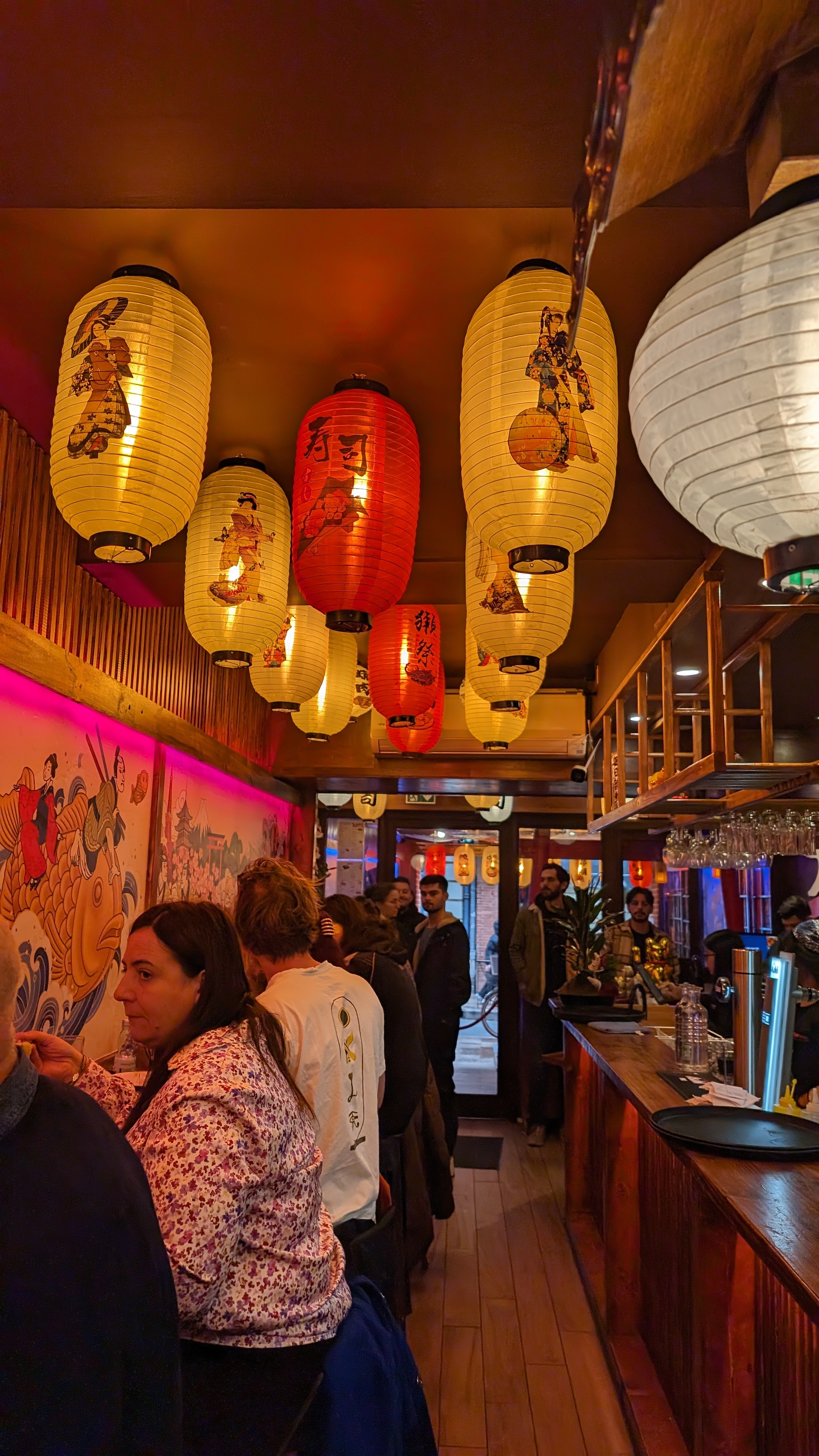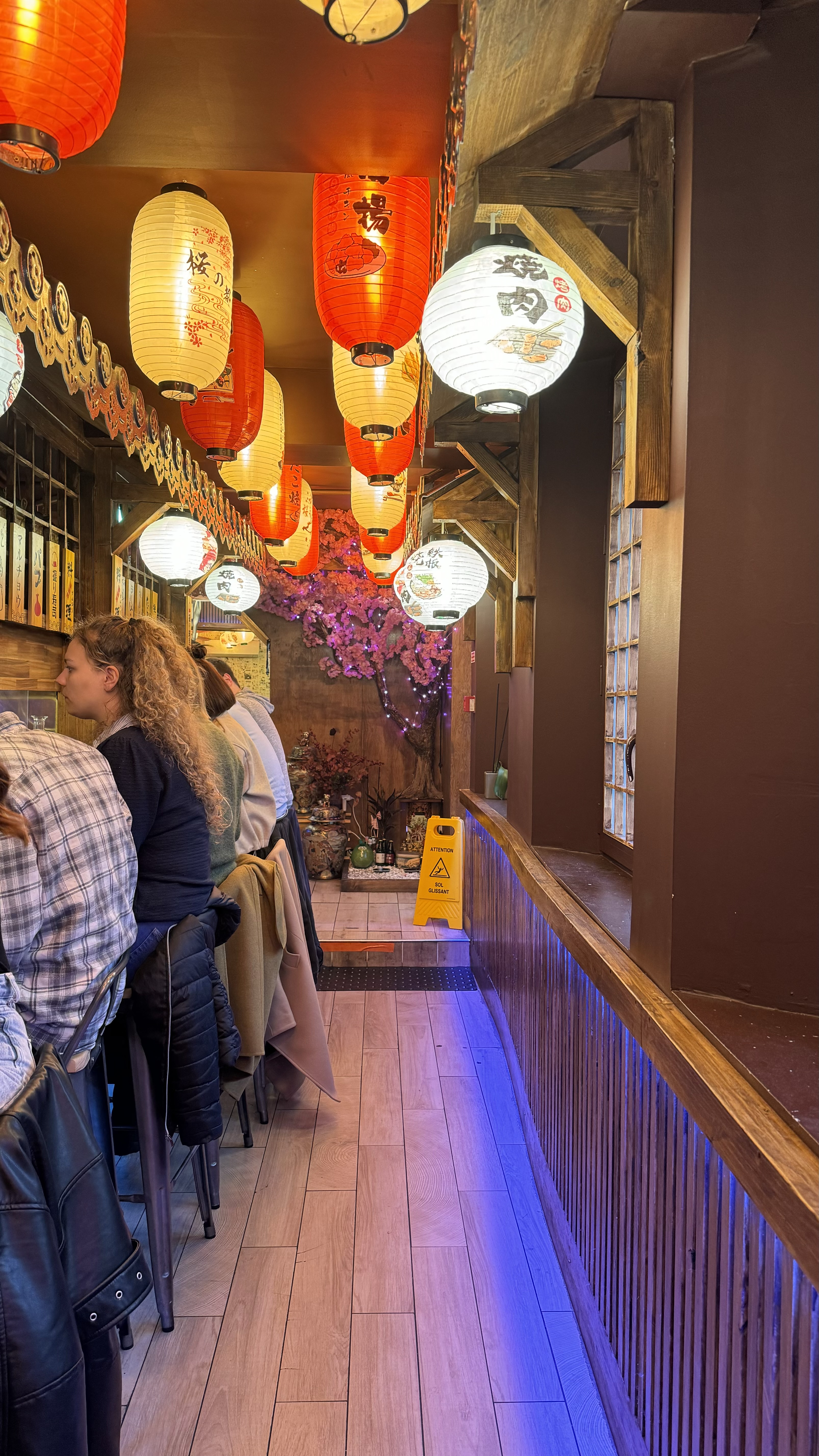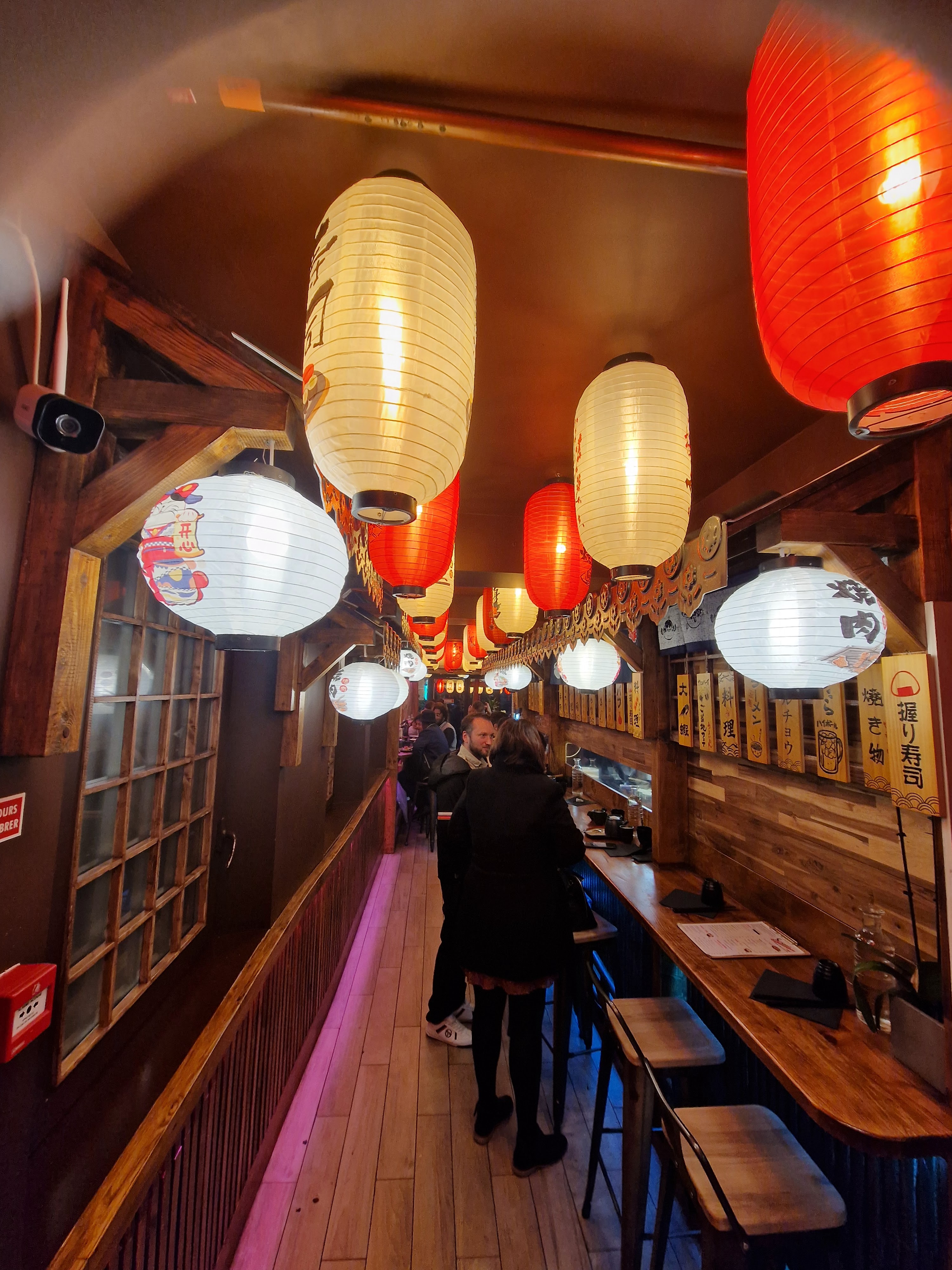Un lieu atypique avec un décors à contempler pour une belle immersion dans les rues japonaises. Ambiance conviviale, personnel accueillant. Il faut être patient avant de prendre place mais ça vaut le coup d’attendre. Pas de réservation.