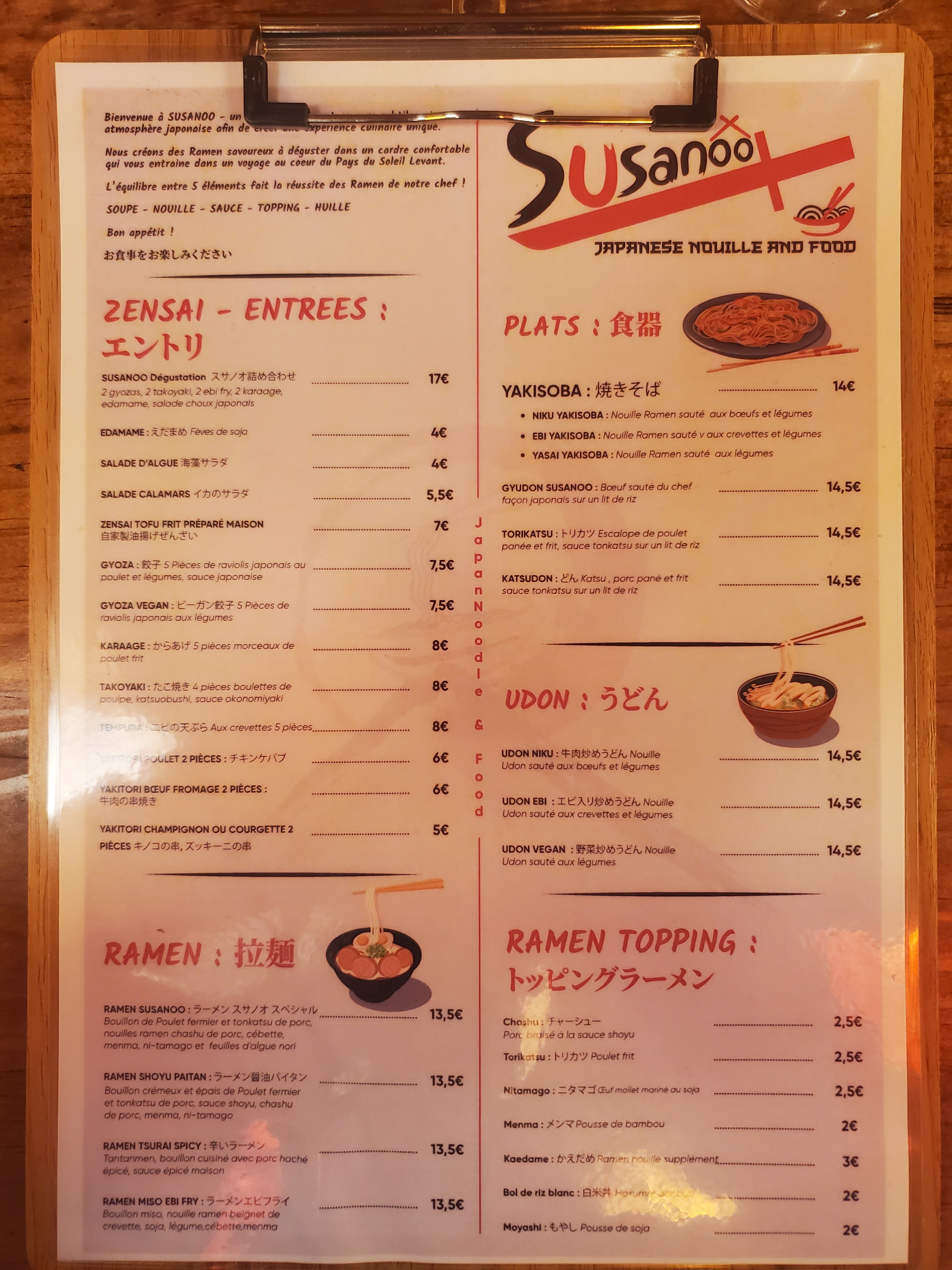 Nous sommes venus à deux un samedi midi au Susanoo C'était très bon et l'ambiance mangas et animés est dans l'ensemble génial ! C'était rempli, on a attendu 20min avant de pouvoir rentrer (selon moi ça reste raisonnable) Mais on nous a servi en décalé ce qui est dommage .... Et j'ai été surprise du rapport quantité/prix. J'ai été habitué aux quantités des autres restaurants de ramen, d'udon et de soba, pour le même prix quasiment. Donc voir les mêmes plats en une quantité qui ne me calle pas , m'a déçu Le moment reste sympathique