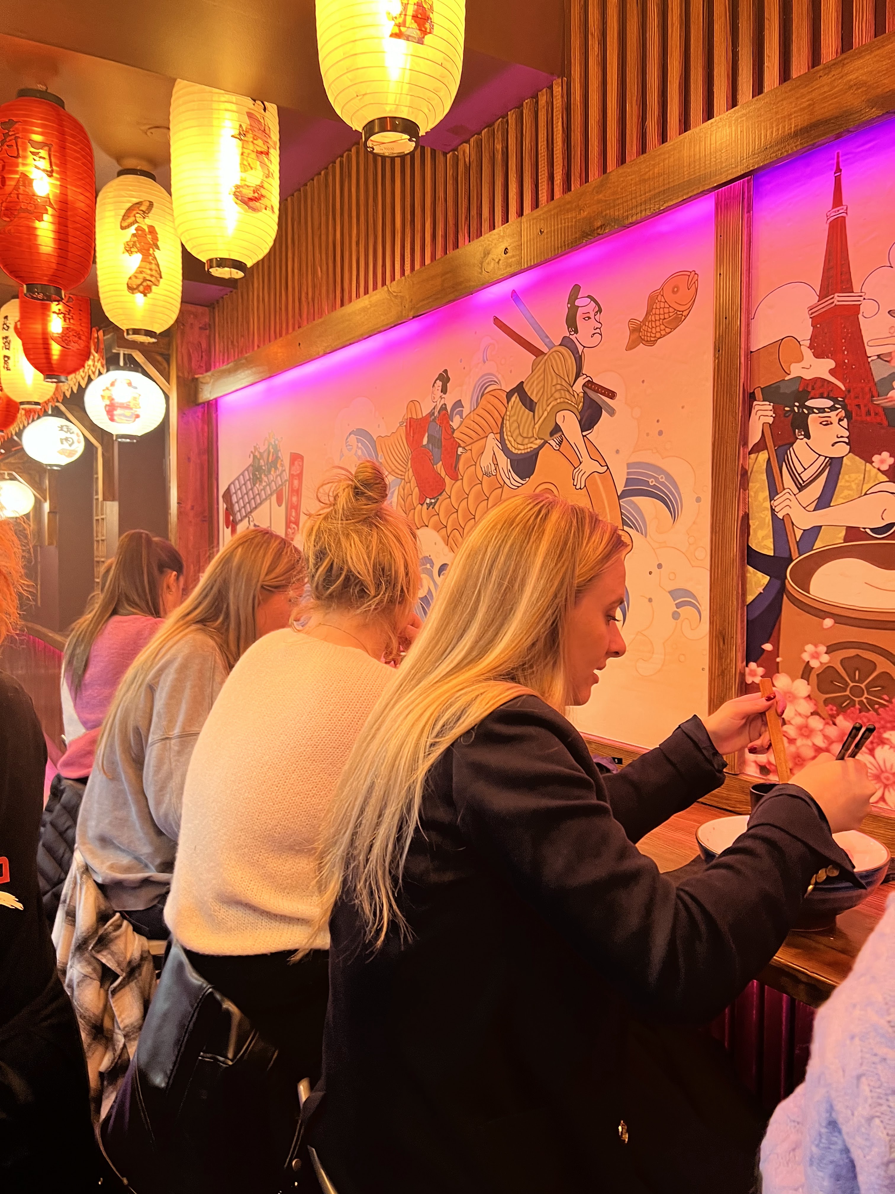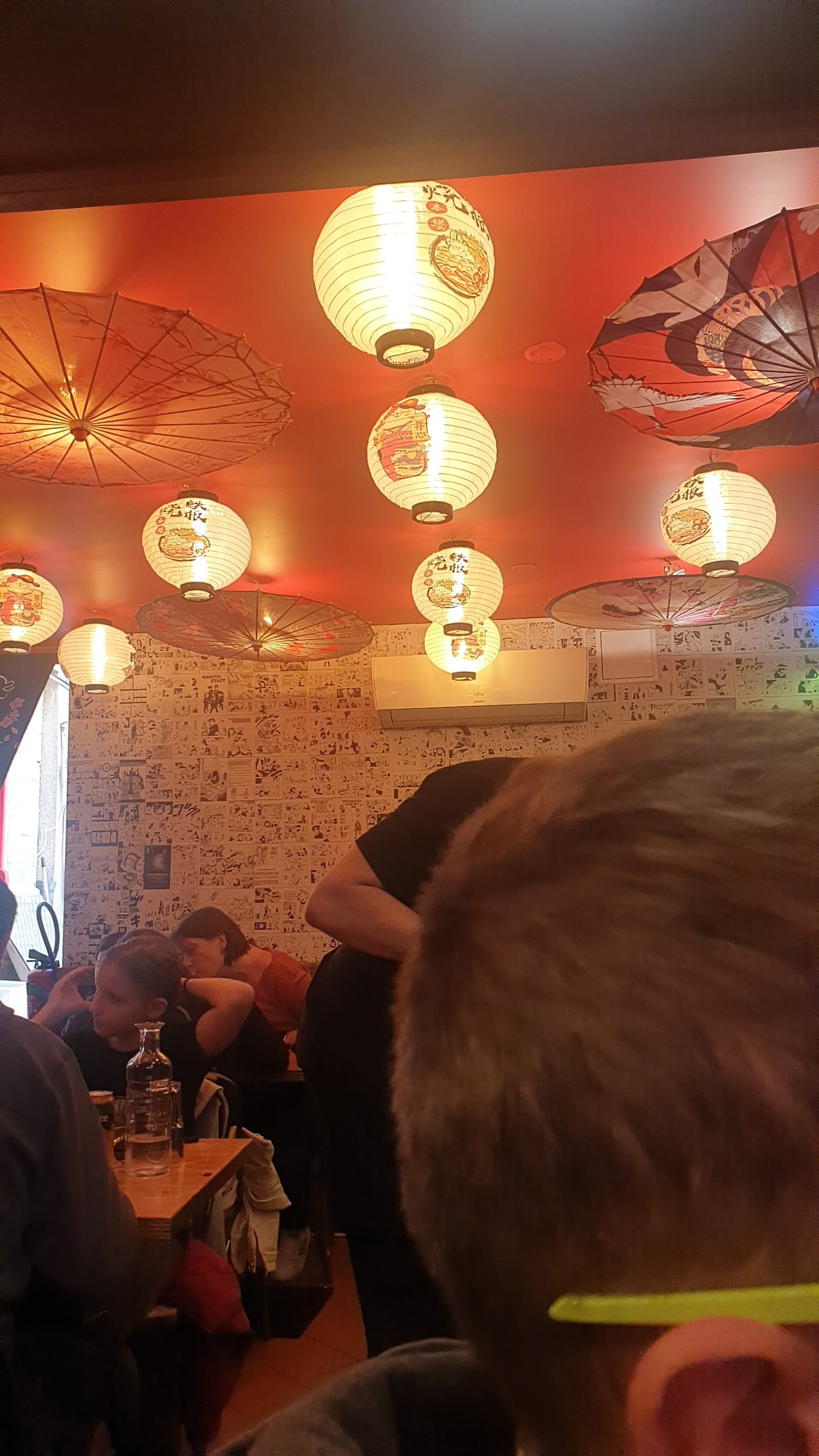 Restaurant japonais spécialisé dans les ramen, les délicieuses nouilles cuites devant nous avec des accompagnements divers : crevettes, porc, bœuf, etc. Peut être mangé avec un verre de saké ou une bière. Décor tapissé d'images dessinées et des pages de manga, certains les lisent.. bon rapport qualité prix, assiettes relativement copieuses, la majorité de mon groupe a évité les desserts pourtant excellents et relativement petits : mochis, cheesecake au yusu, titramisu au thé, ...