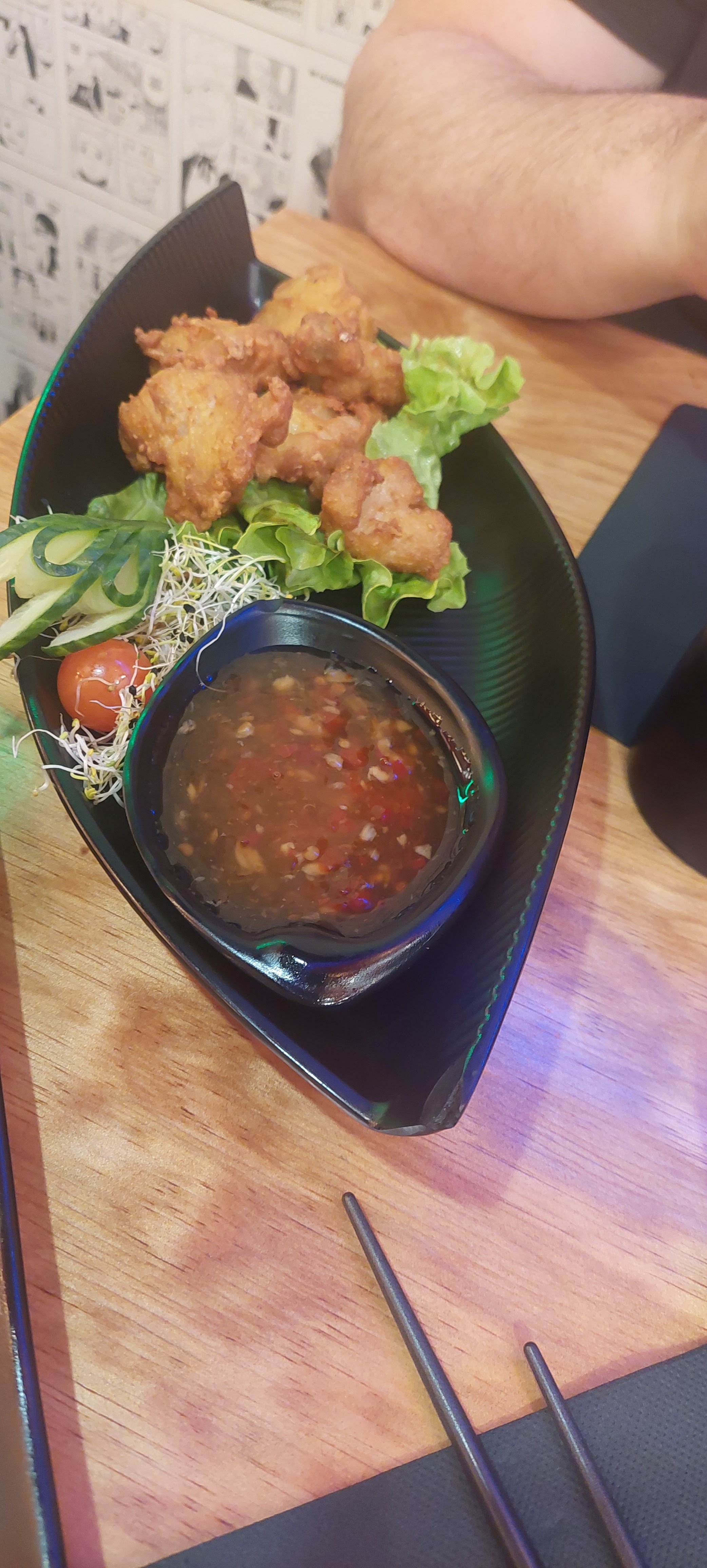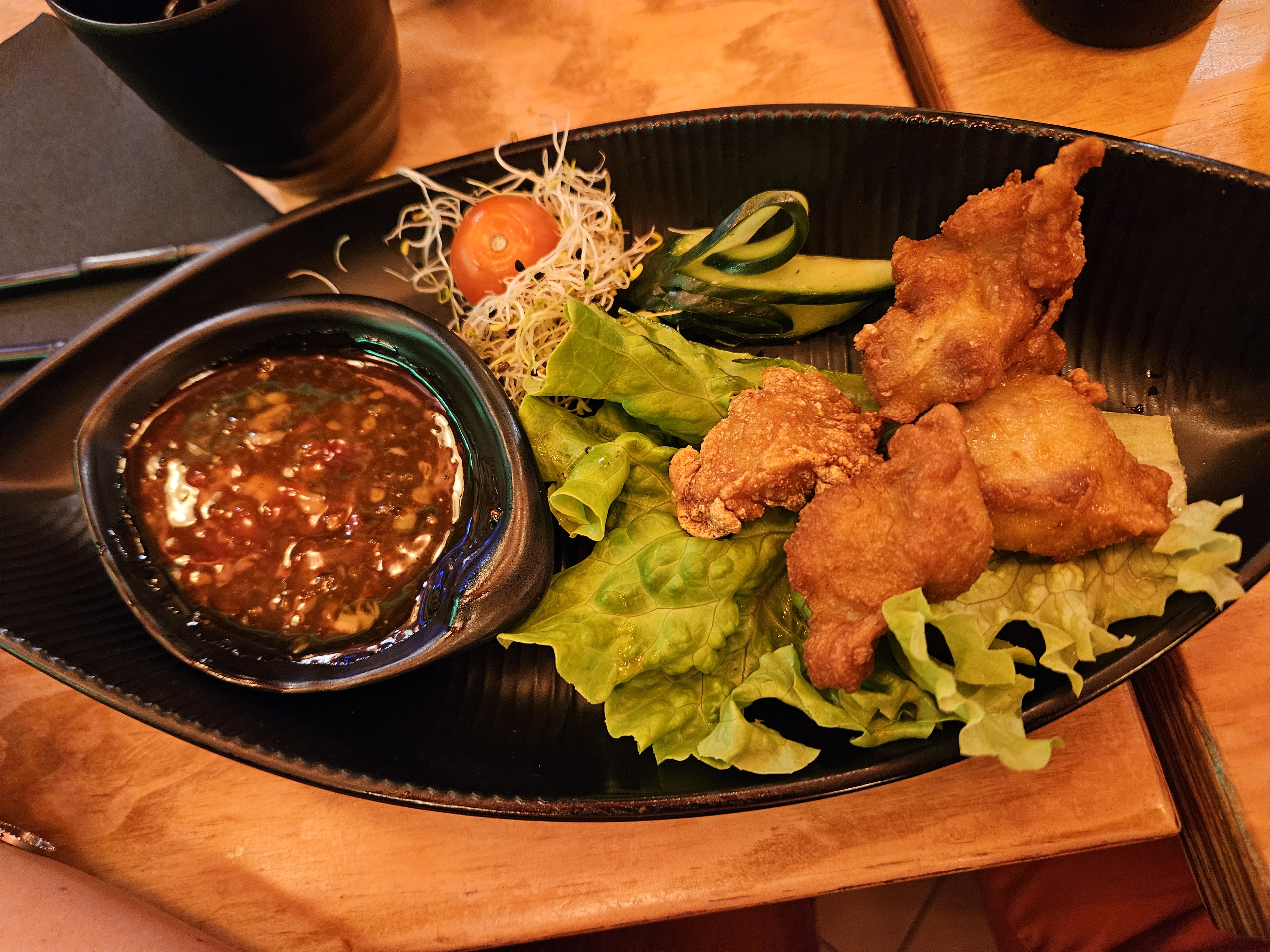 Une décoration travaillée et dépaysante mais un peu chargée pour moi. Les ramens n’étaient pas mauvais mais manquaient de saveur et d’impact. Les nouilles étaient un peu trop molles à mon goût (je n’ai pas pensé à préciser la cuisson mais ne sais pas si c’est faisable d’ailleurs) On sent quand même une influence Chinoise dans les plats, notamment la sauce piment sucrée avec les karaage..