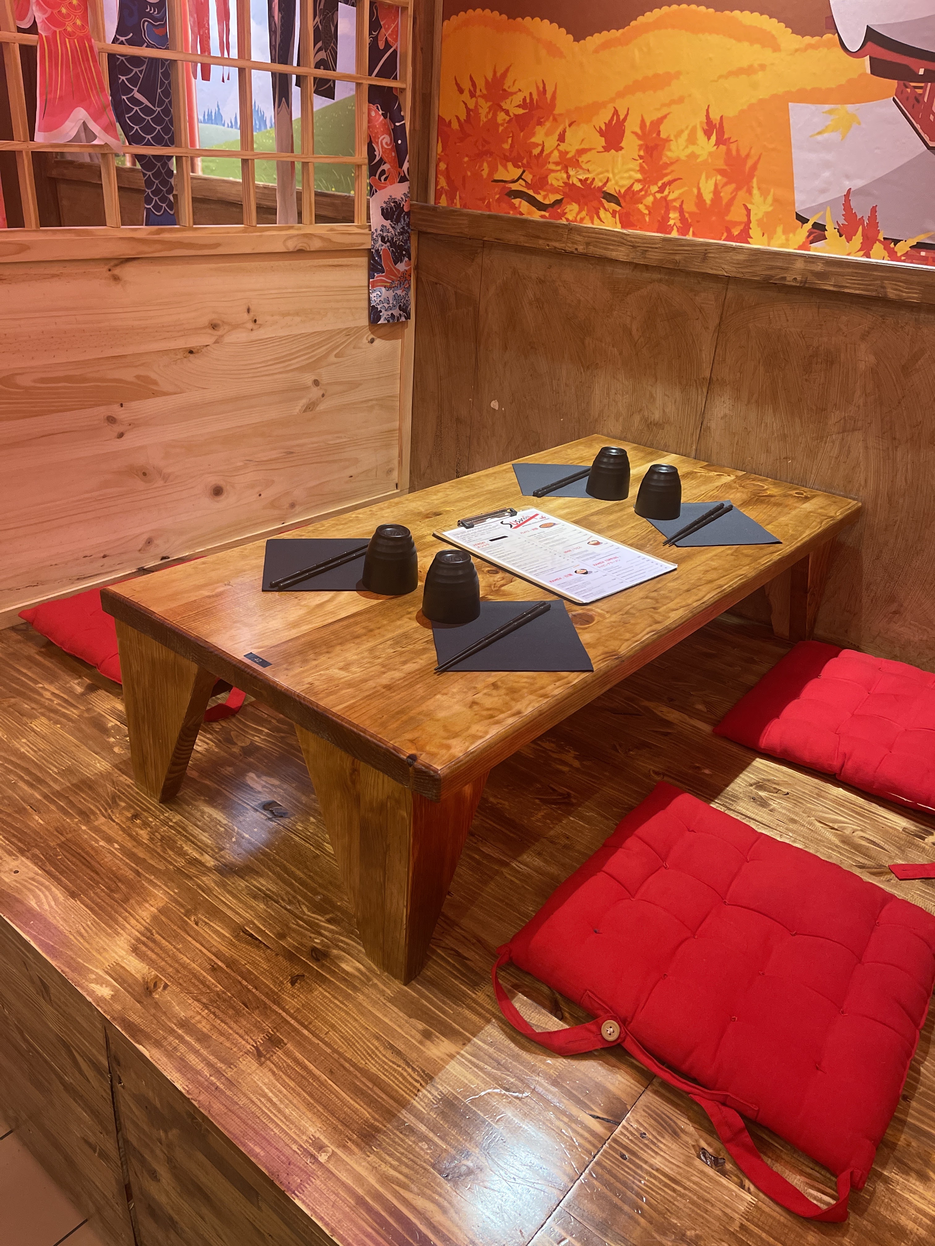Tatamis fortement déconseillés, vous êtes assis sur du bois et des pauvres coussins, en tailleur, totalement contorsionné ! Le riz n’est pas incroyable et globalement la nourriture trop salée accompagné beaucoup trop d’erreurs dans le service! Établissement surcoté, la déco ne fait pas tout!
