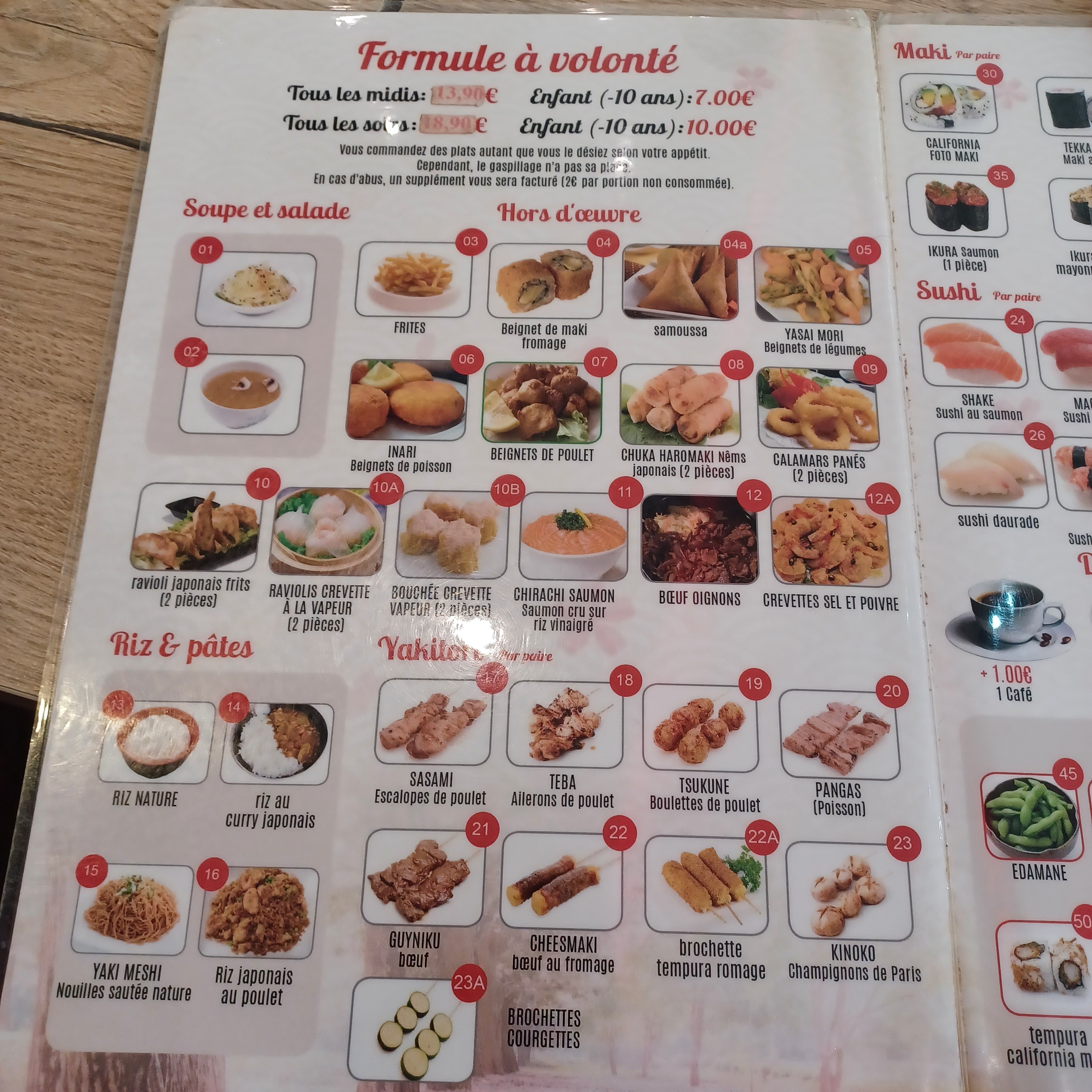 Menu à volonté à prix raisonnable, large choix. Il est possible de prendre qu'une seule portion de sashimi mais c'est déjà rare d'avoir la possibilité d'en prendre sans supplément dans ce type de menus. Par contre je suis déçue par la qualité des california, mal découpés, de petites tailles, ils se décomposent très facilement.