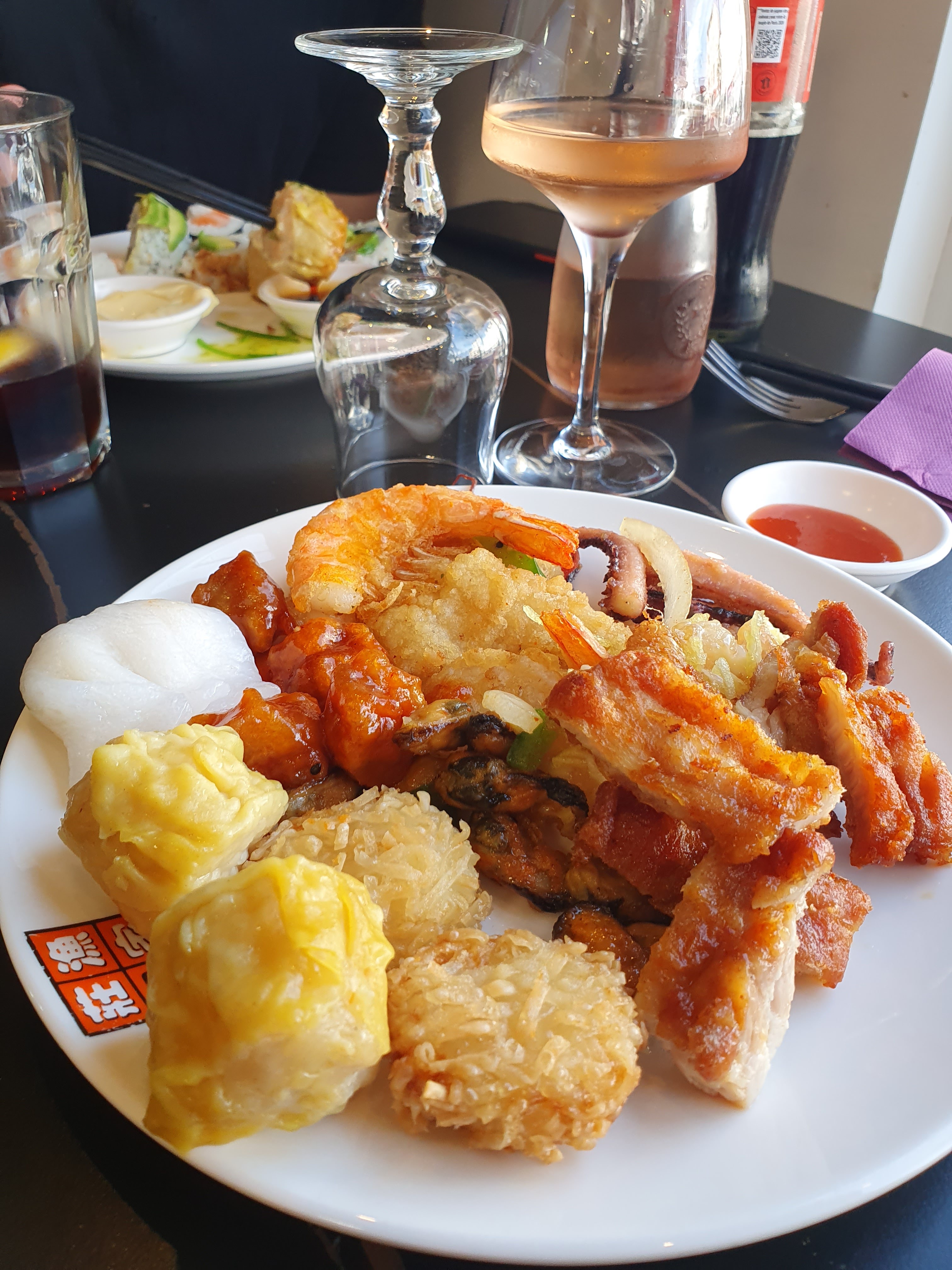 Première visite dans ce lieux au milles et un plat présent dans le buffet. Dans le buffet (20€) il y a : Sushi Maki Saumon cuit Plats chinois (canard laqué, porc au camarel ..etc) Mets tel que nem ravioli bouché crevette Fromages Dessert Fruit Fontaine de chocolat Fromage Liste logiquement non exhaustive Restaurant validé très bon et ouvert à 18h30 pour ceux qui mange tôt