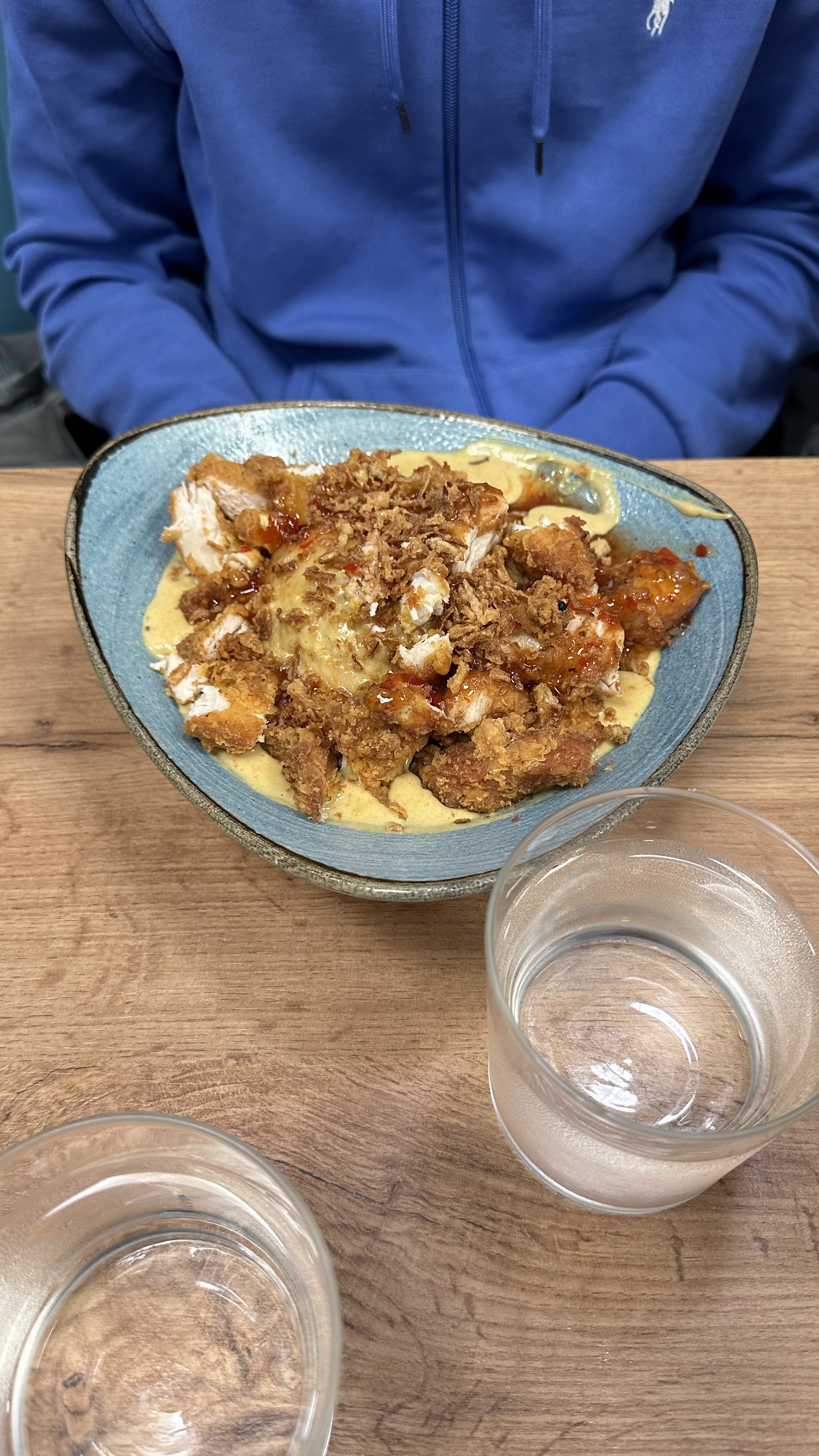 J'ai pris riz au poulet pané sauce échalote brochette bœuf fromage et des krispy Excellent vraiment je regrette pas en sachant qu'à mon arrivée je n'avais pas d'appétit la première cuillère était suculuente j'y reviendrai pour goûter tout le reste Merci à l'accueil et à l'équipe. La quantité de riz ma suffit moi qui suis une grosse mangeuse en générale je dis sa par rapport aux avis négatif concernant ceci