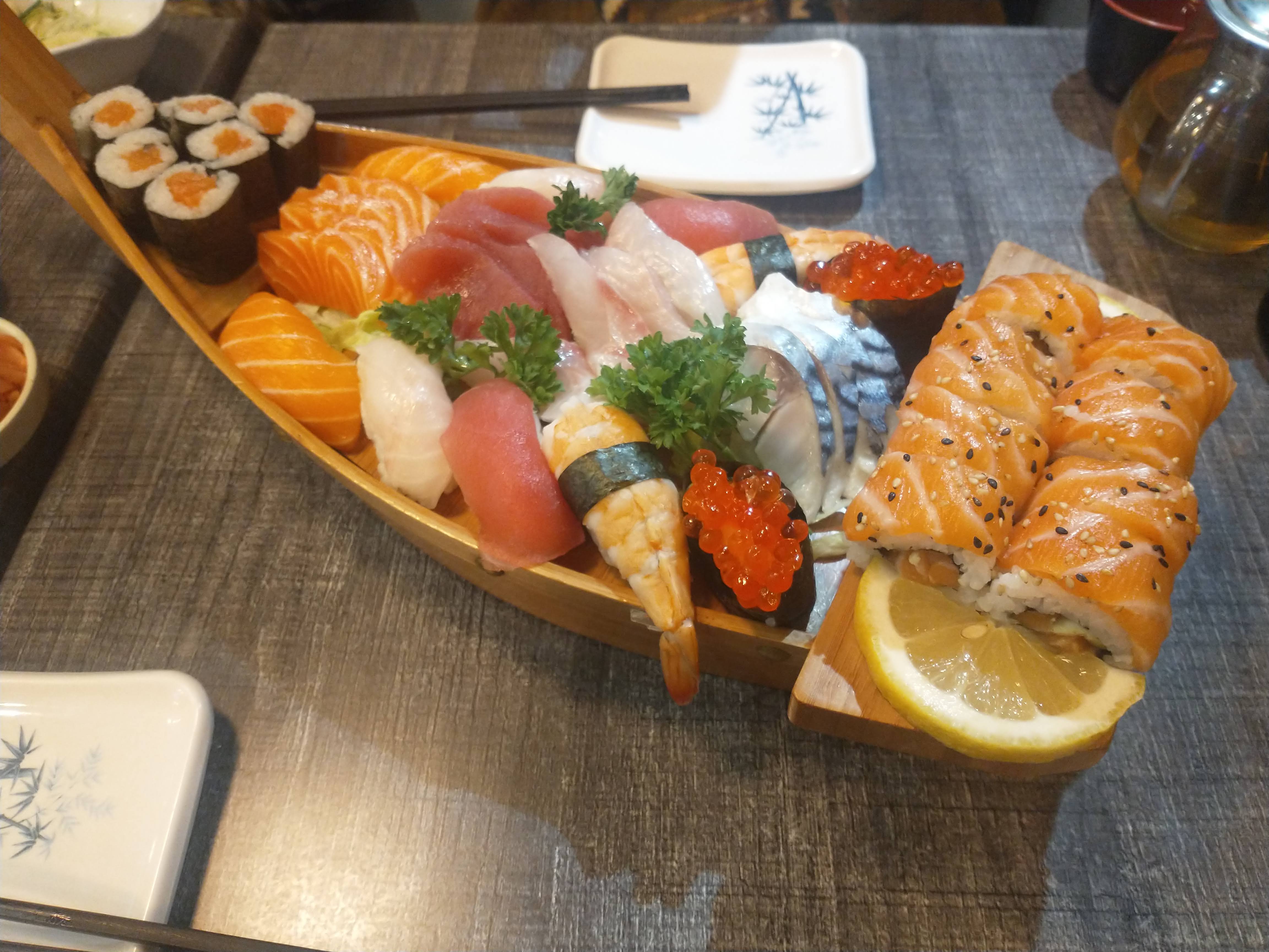 Tout est parfait. Le menu bateau est typique. Les suchis succulents. Maki délicieux et sashimis divins