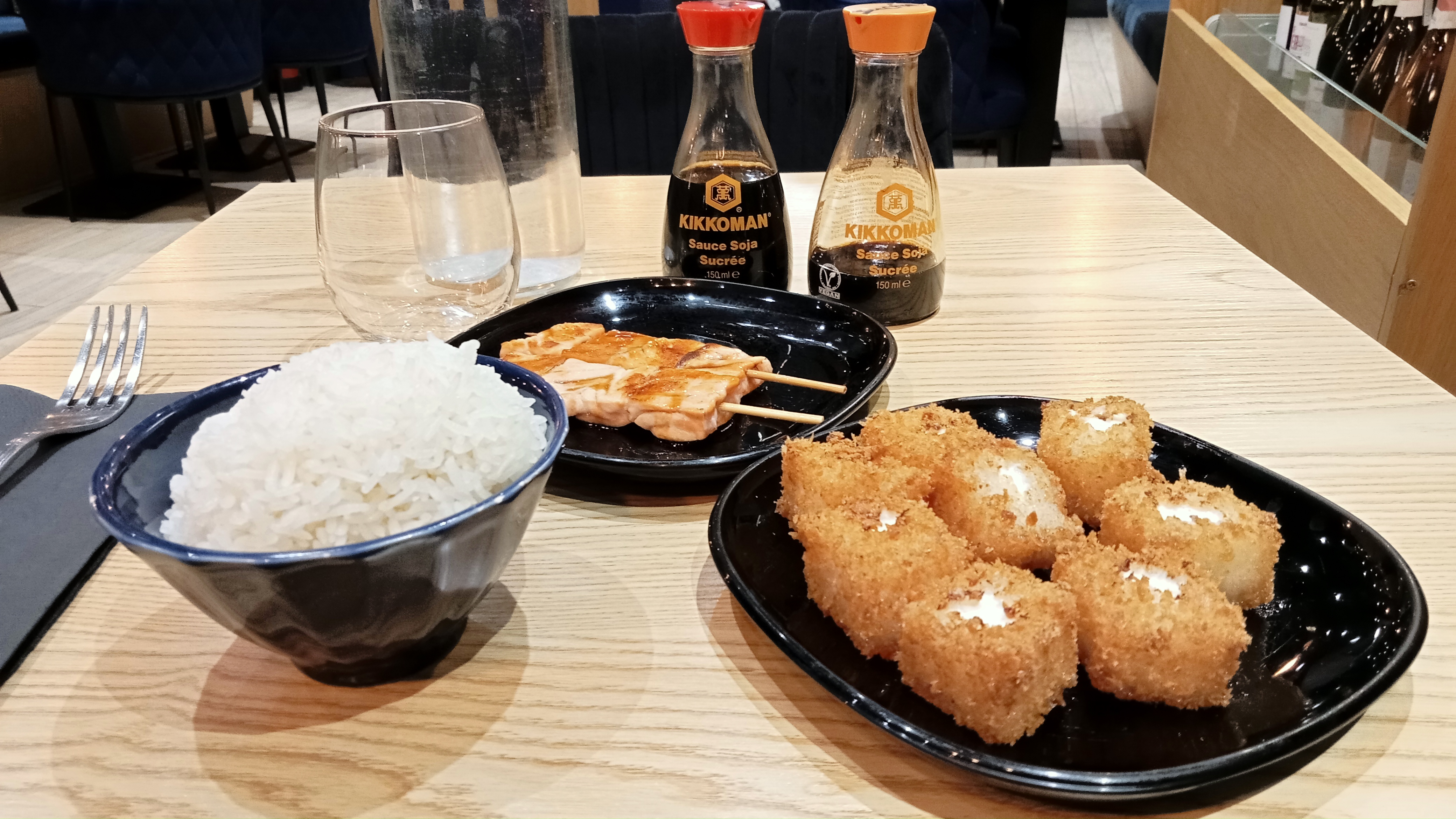 Pas terrible trop de riz pour les sushis et feuilles nori encore dur salade de choux trop vinaigrée brochette moyenne je ne recommande pas