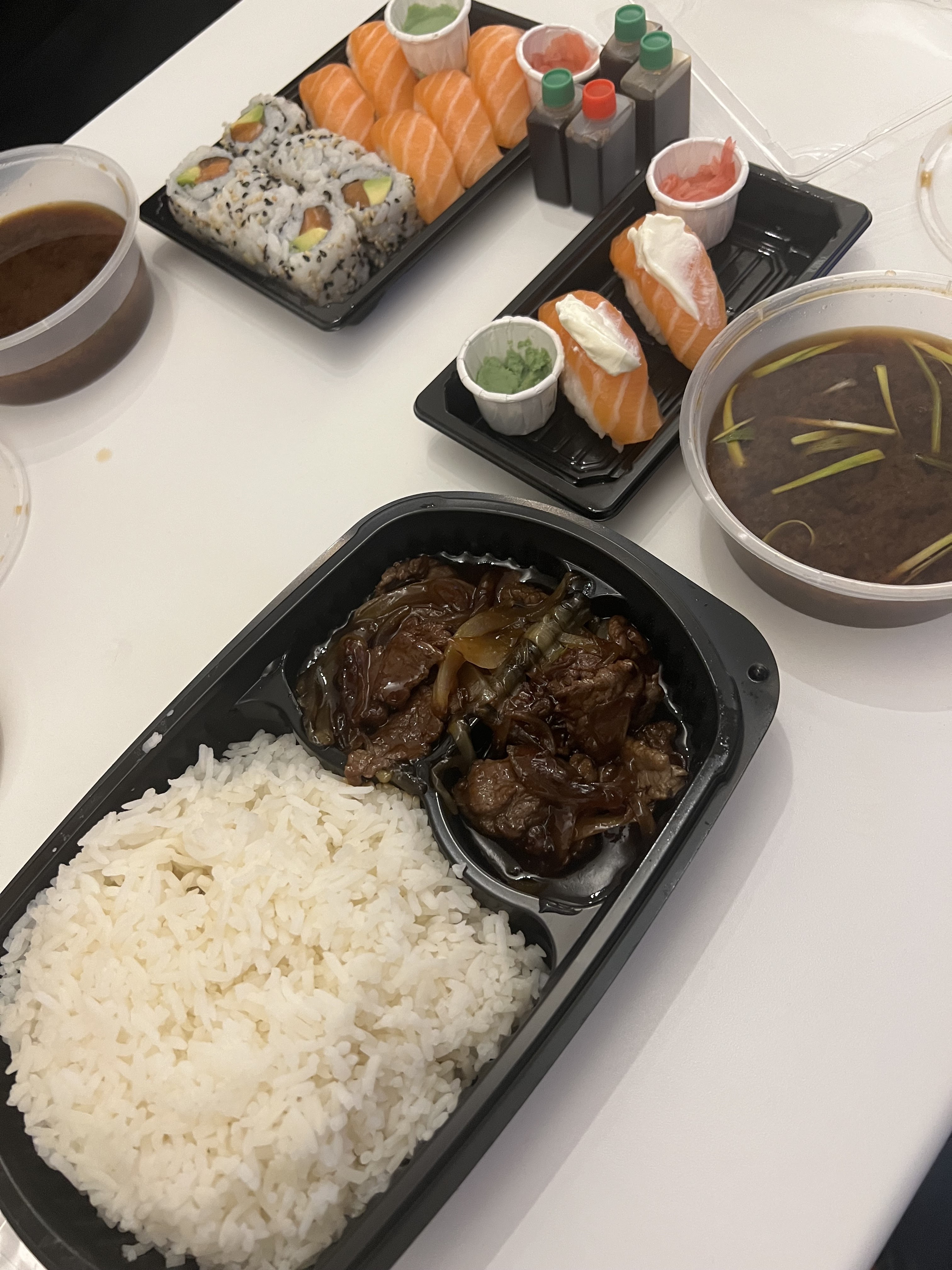 J'ai aimé la salade et la viande (halal), mais je n'ai pas apprécié les sushis, ils avaient trop de riz pour moi.