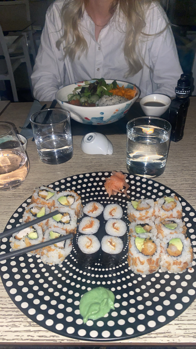 C'est bon, c'est beau avec cette magnifique étagère fer et bois de la cave à vin , l'équipe très sympa et pouvoir mélanger l'expérience sushi avec un choix de vin conseillé par un véritable sommelier Wath Else !!!!!