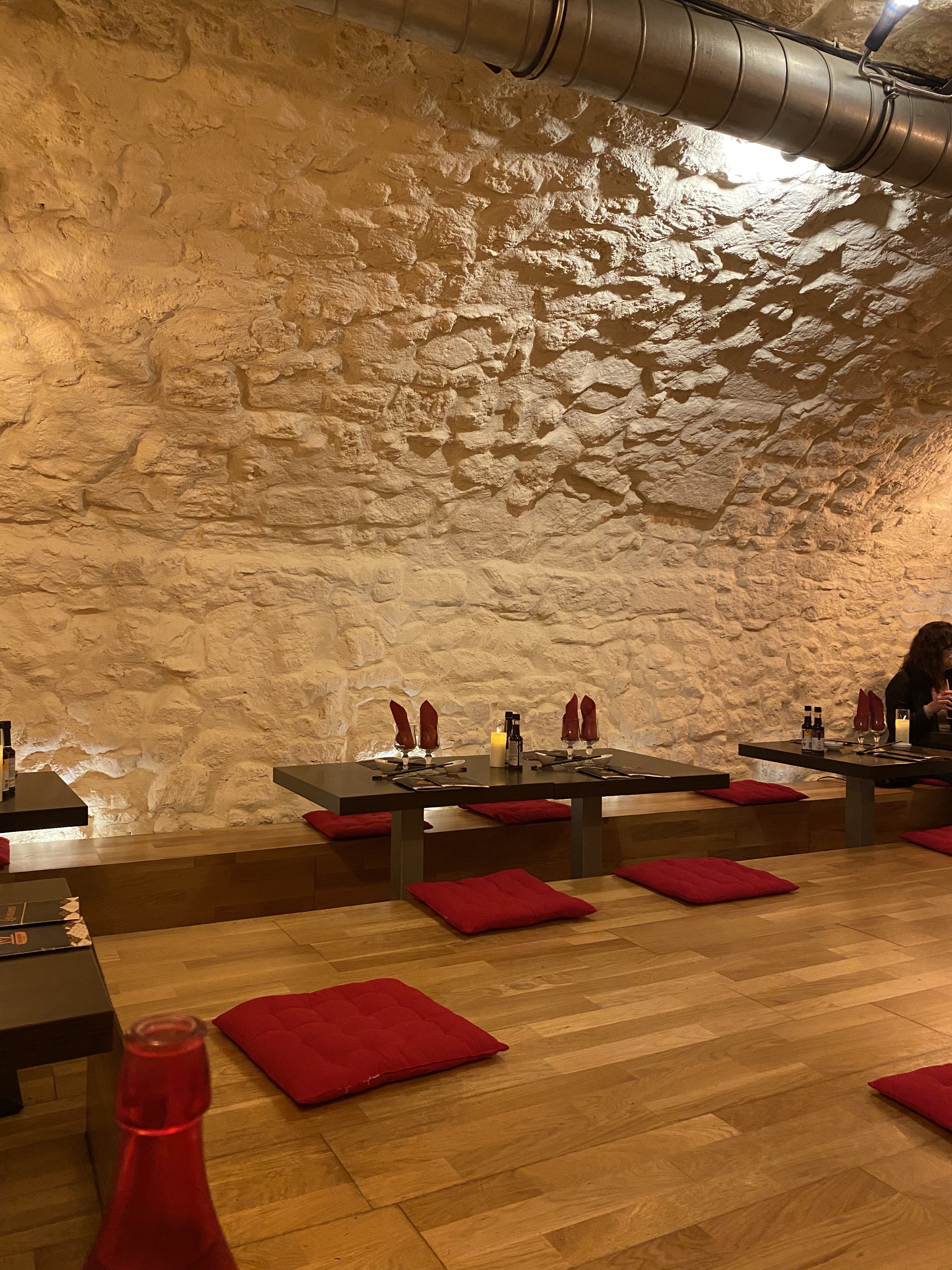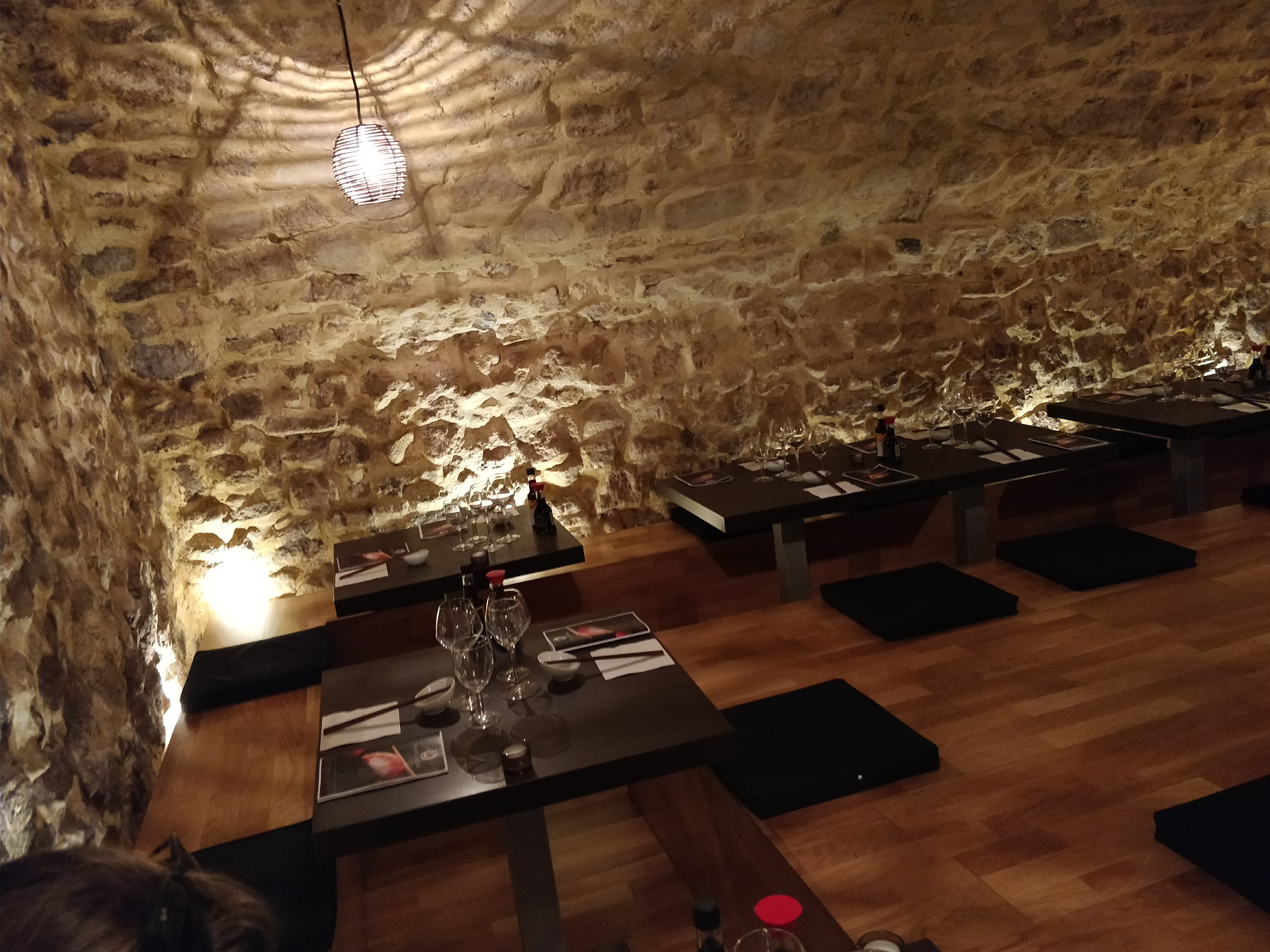 Voûte en pierre magnifique. Mais toutes les tables n'y sont pas, certaines sont au niveau de la cuisine, d'autres carrément dans l'entrée du restaurant. De plus, le saumon et le thon n'ont pas de goût, sans doute du premier prix. Dommage pour un restaurant de sushis...