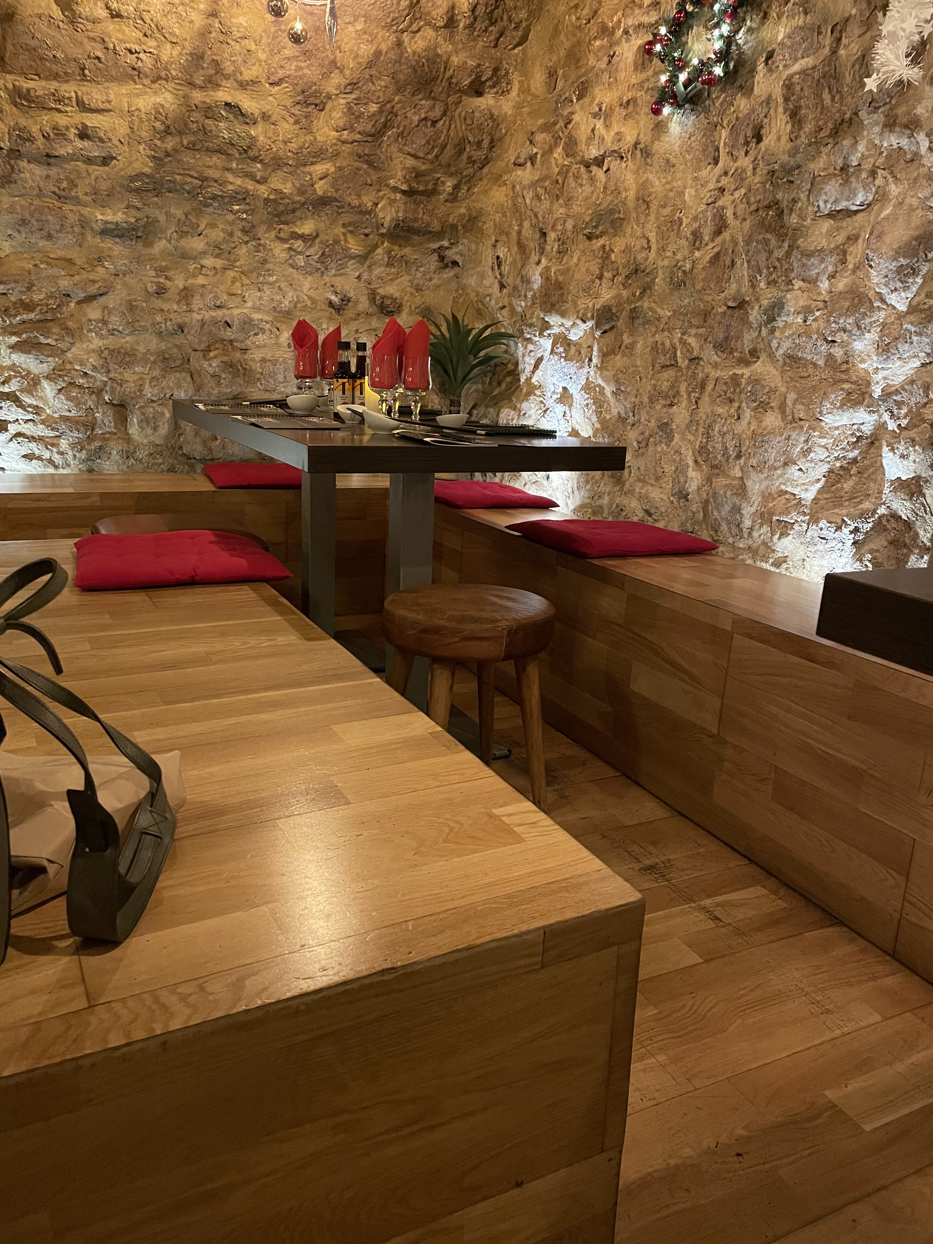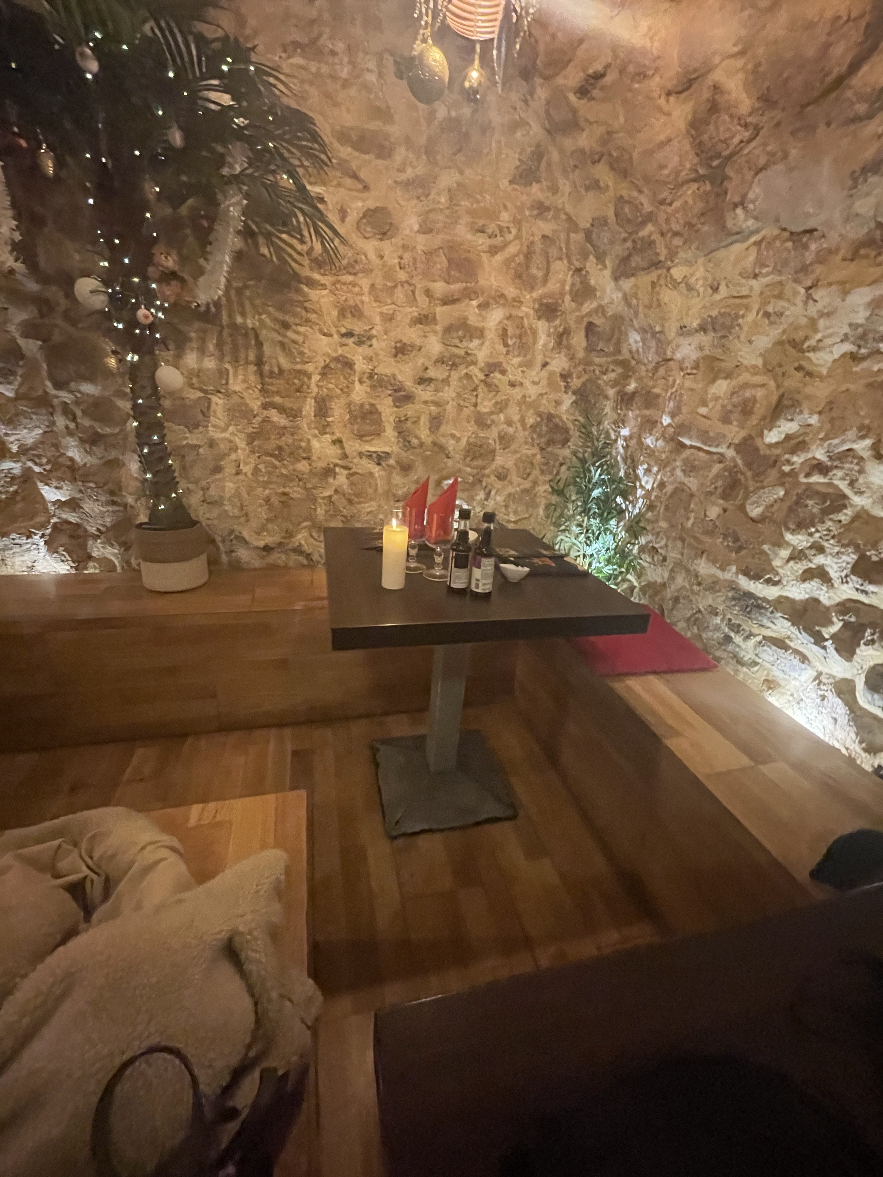 Ambiance feutré cadre magnifique tout en pierre. Petit cousin a la place des chaise. Genial. Repas copieux et délicieux. Pas trop cher. Service rapide. J y retournerais volontier.
