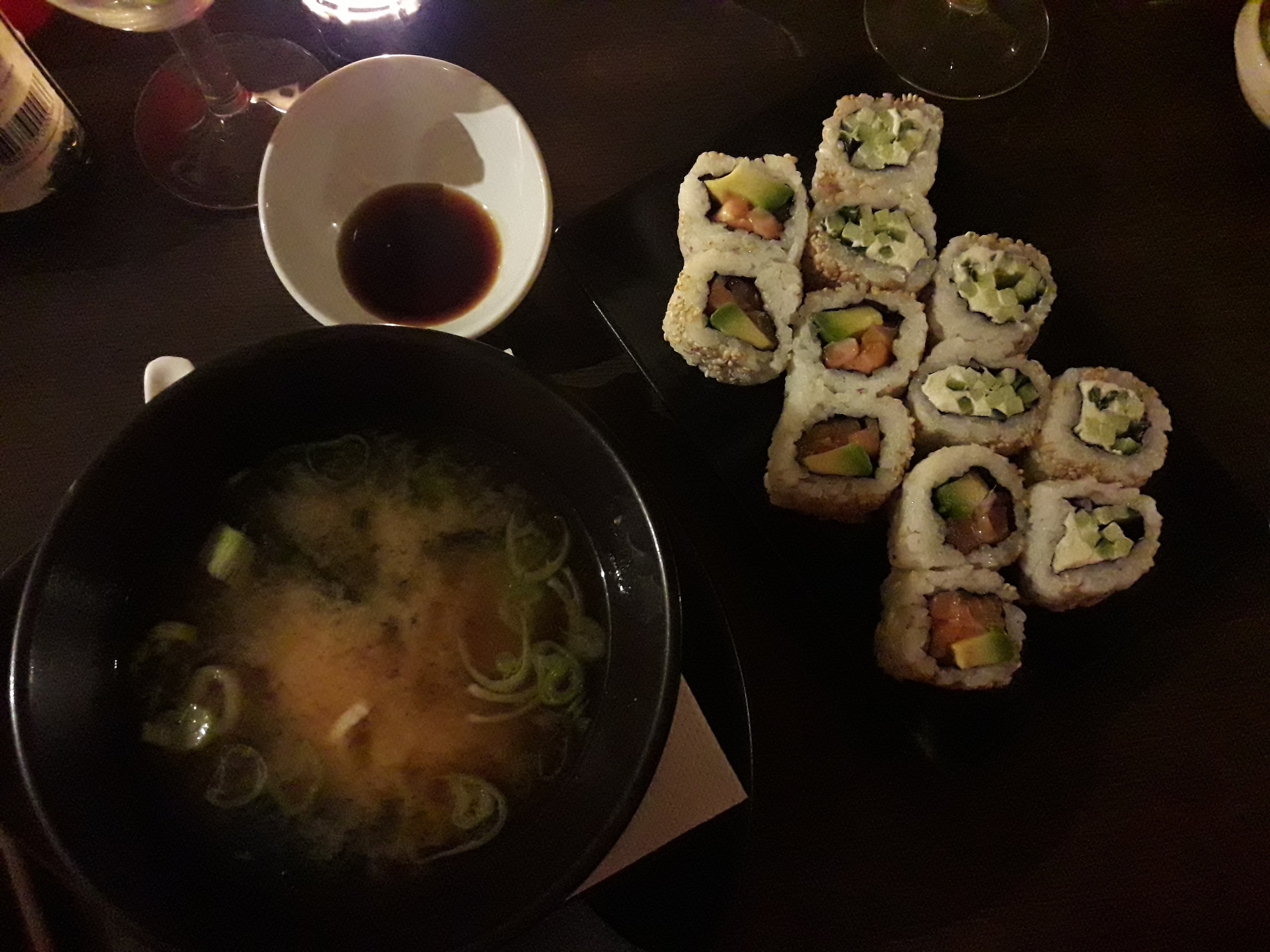 Le riz pour les sushis était très pâteux et ne ressemblait pas du tout au riz à sushi japonais. Le poisson était maigre et pas frais. Soupe miso très diluée.