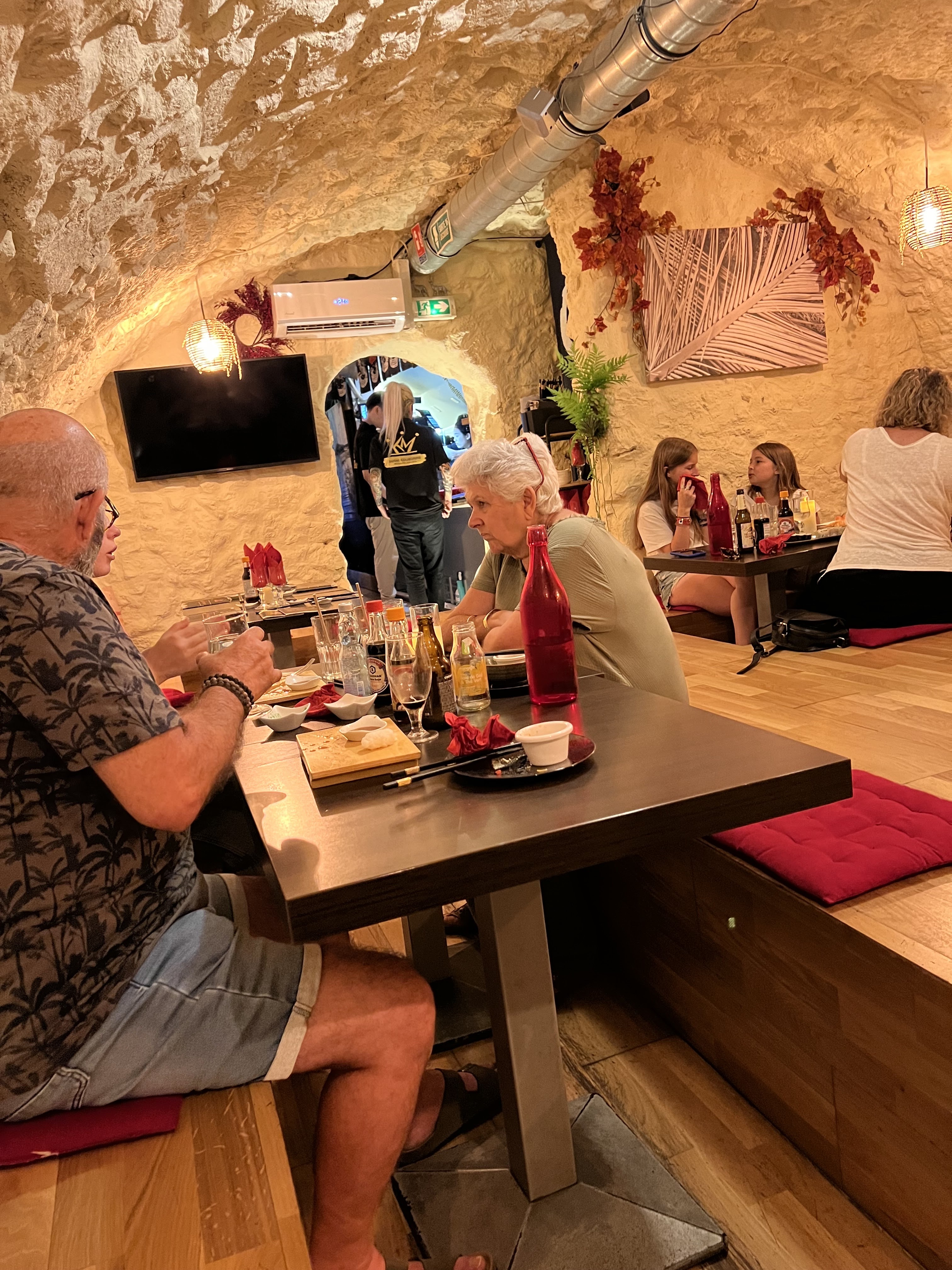 L'emplacement est très agréable, une grotte où vous vous asseyez confortablement par terre devant votre table. Ma nourriture était excellente, je n'avais que des sushis et le rouleau de dragon était incroyable. Le seul problème, c'est que l'endroit était plein et que le serveur avait du mal à suivre autant de monde. Ainsi, parfois, les tables devaient attendre avant d'être servies. Ce serait probablement une bonne idée de venir à midi si vous souhaitez être servi rapidement. Nous avons passé un bon moment dans l'ensemble.