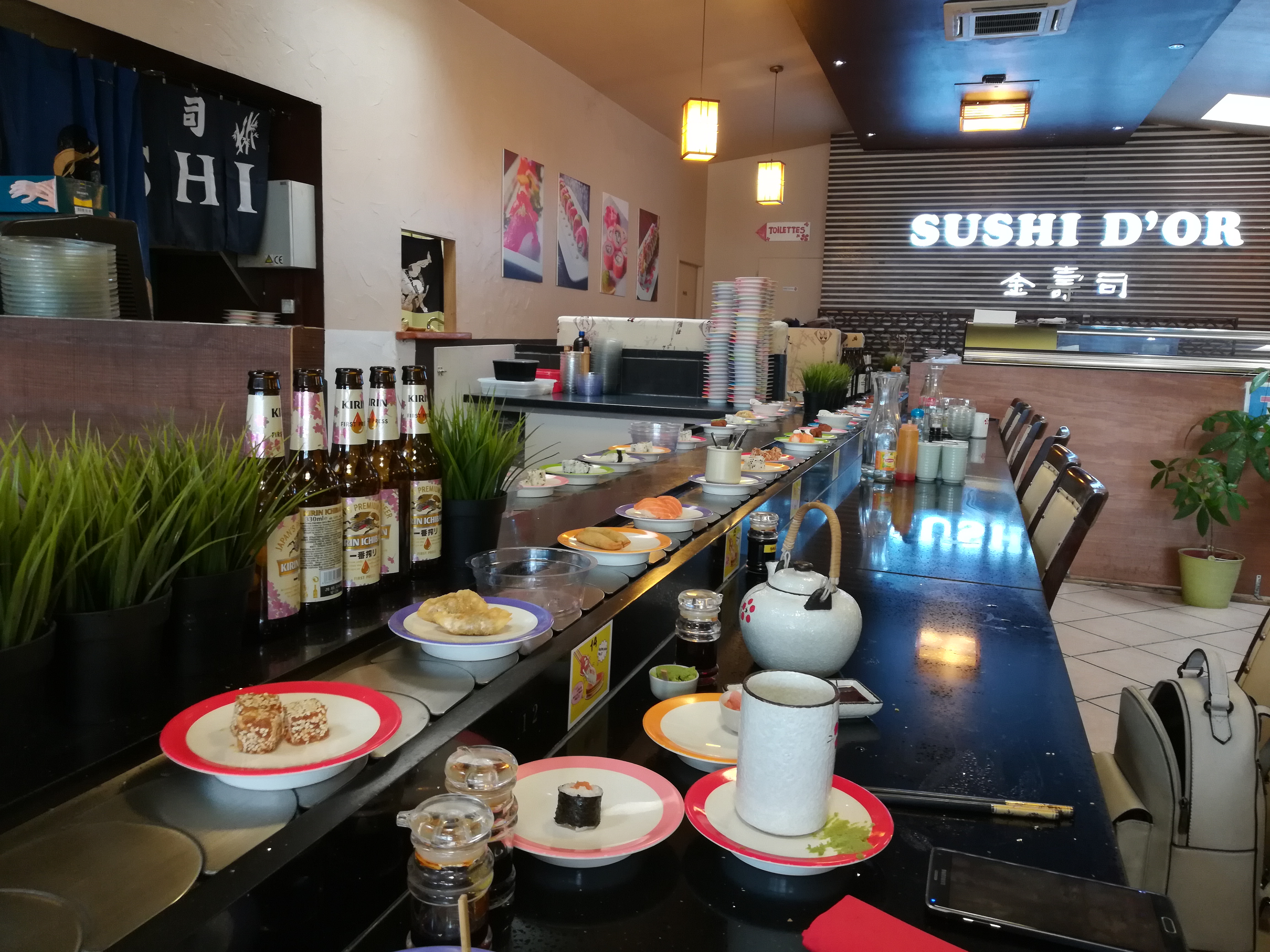 J adore ce restaurant nous mangeons très bien et j adore le système de tapis roulant et les sushis sont très bon et originaux et un gros bonus pour le sushi dessert banane crêpe chocolat un délice