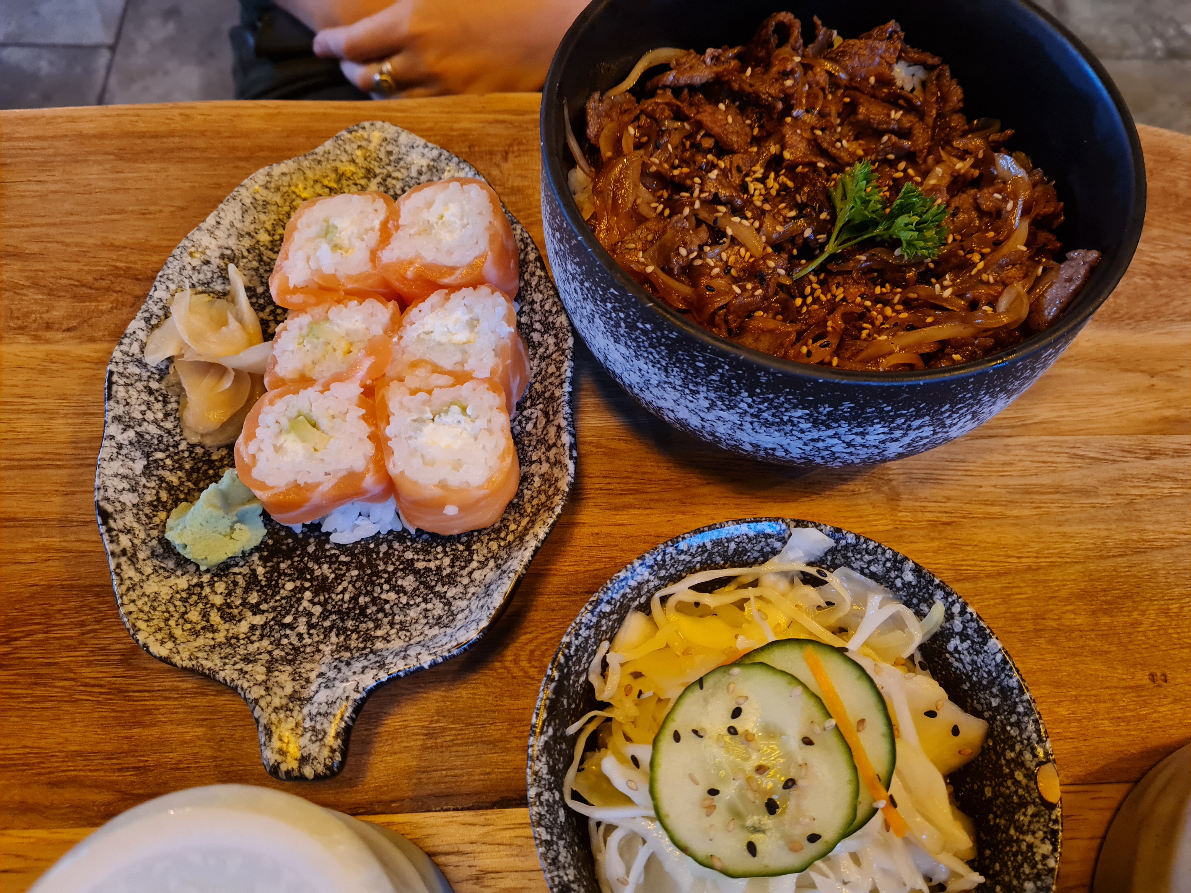 Une belle assiette, des réalisations de qualité. Un peu déçu par les 5 petits morceaux d'oignons frits collés sur les maquis au lieu de d'une belle couverture. Une garniture plus importante en gingembre serait appréciable aussi