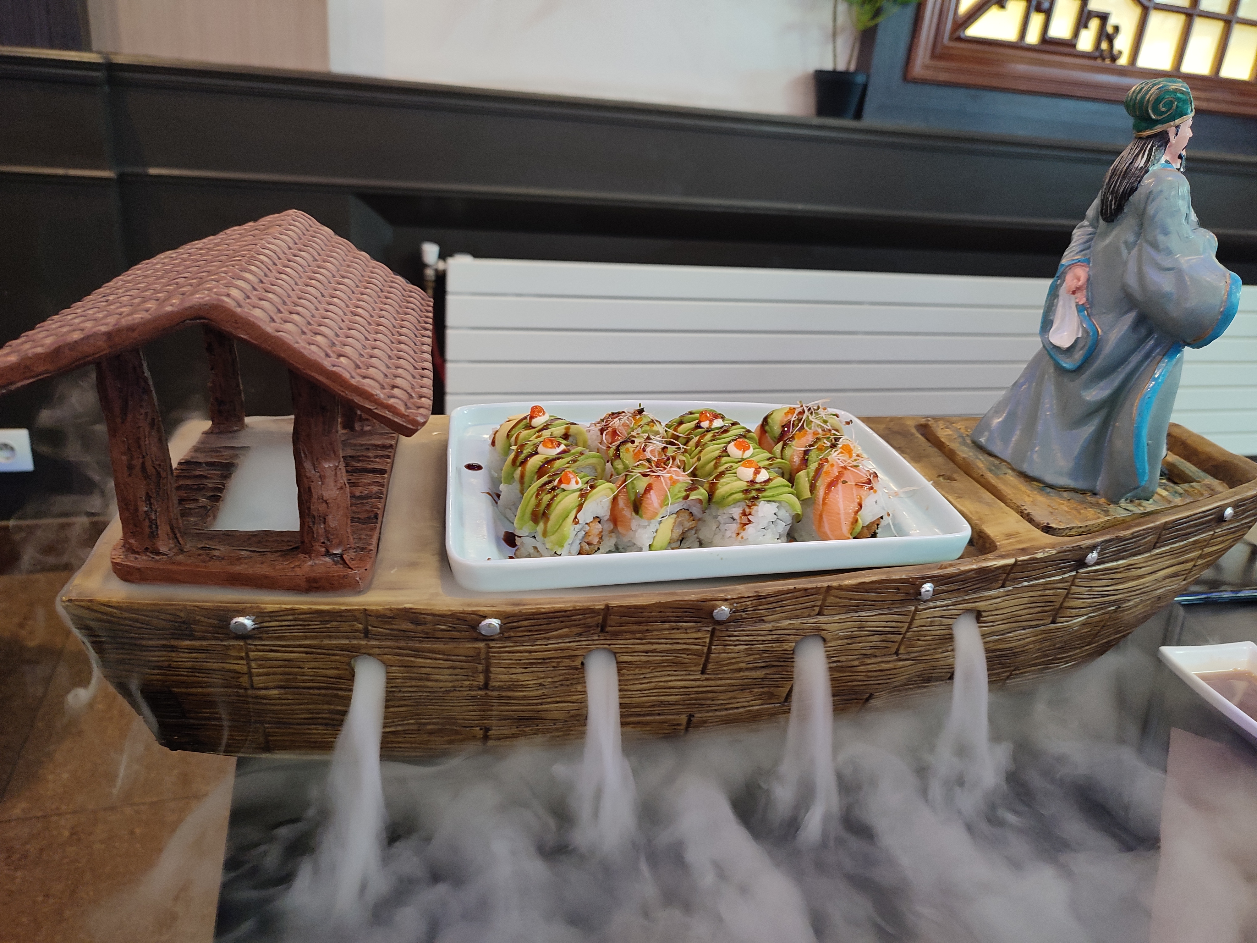 Le concept est très sympa la déco super mais le service est long et certains plats ne sont pas très bon (boules coco froides et brochettes bœuf au fromage toutes petites), pour ce qui est des sushis c’est correct ils sont vraiment garnis.
