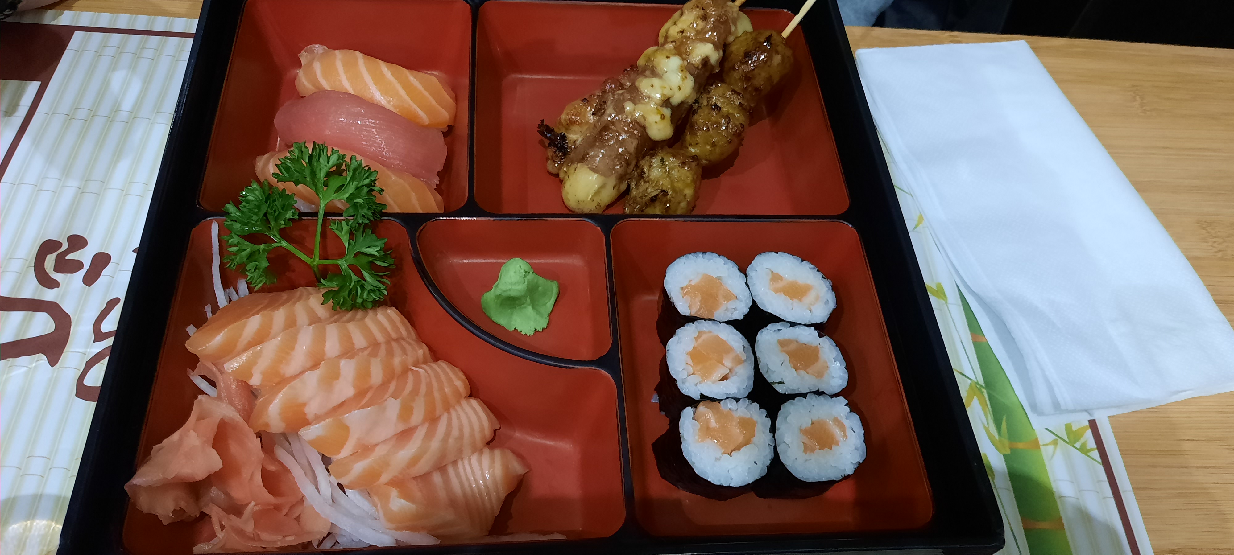 un menu chirashi saumon, très cher. depuis 2 ans, la quantité à réellement diminué, des LAMELLES plutot que des MORCEAUX (VOIR LES PHOTOS SUR SITE) . salade réduite. vous serez rassasié par le BOL DE RIZ.. mais pour payer 15,50 € il faut être à la hauteur !! SUIS TRÈS DÉÇU ET JE PENSE NE PAS Y REVENIR...