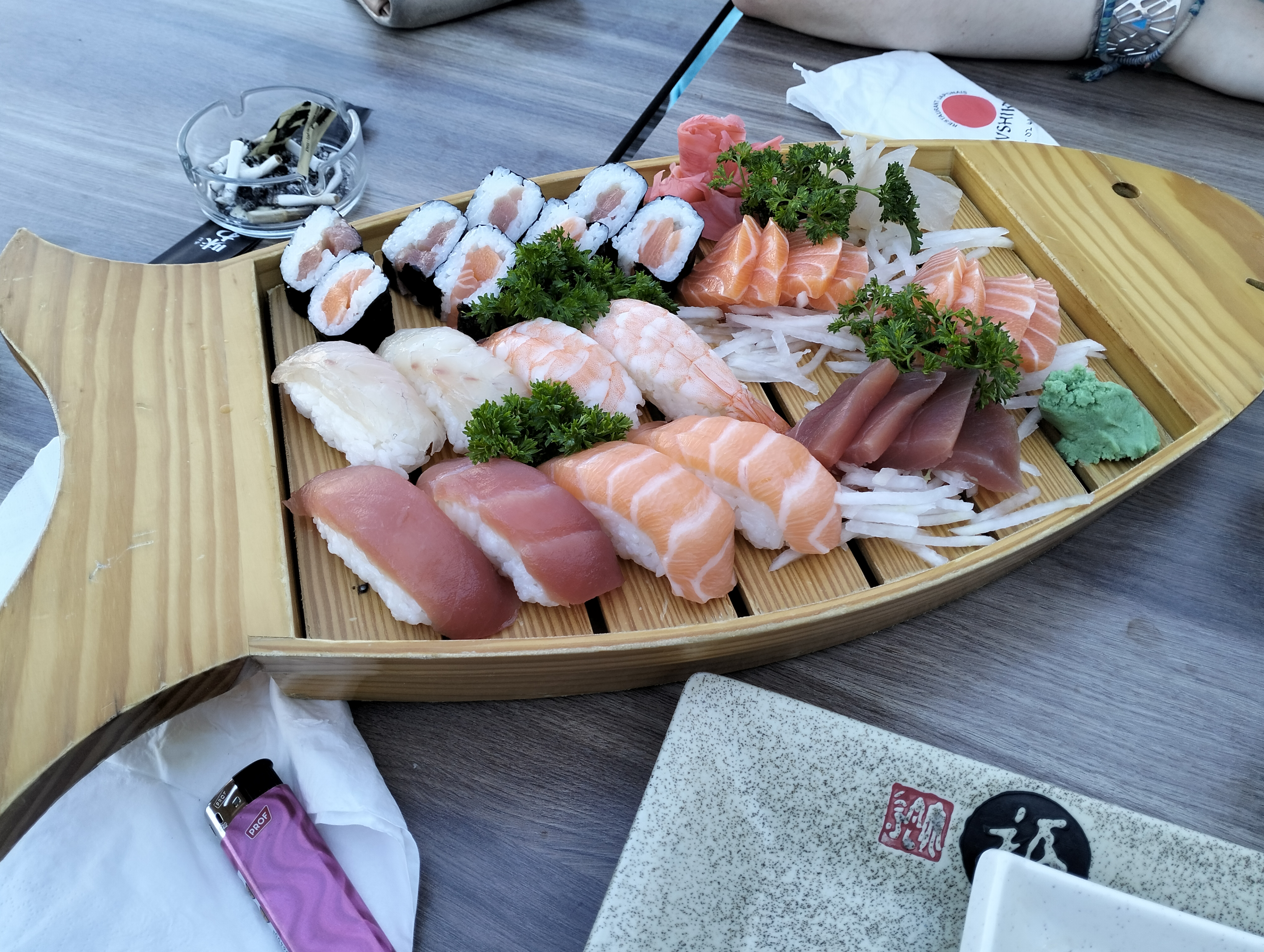 C'est agréable de manger sur la terrasse quand il fait beau , il y a des parasols pour ceux qui préfèrent l'ombre. Les menus sont une combinaison de brochettes et/ou sushis donc chacun peut trouver ce qui lui convient. Prix raisonnable, accueil et service un peu froid mais efficace, et c'est bon.