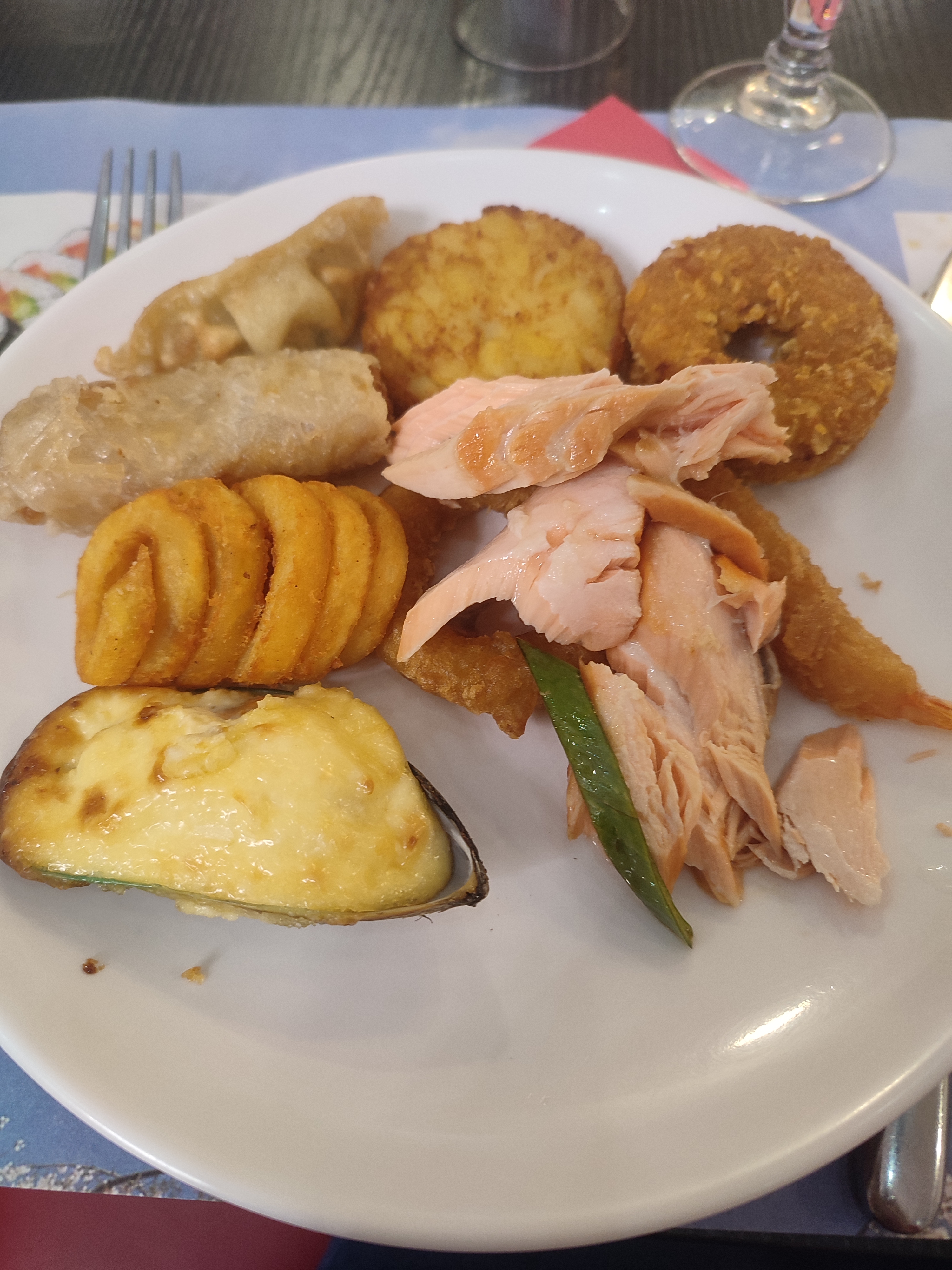 J'ai manger du saumon qui été plutôt bon , mais qu elle déception avec les beignets crevettes 🍤 les cuisses de grenouilles , et j'en passe tt les plats sont hachis réchauffé j'ai manger des beignets de crevettes qui ressemblais à des chips tellement c était dur , les sushi 🤮🤢 chaud les températures des frigots de sont vraiment pas respectés , le dessert casi néan une île flottante chaude vraiment pas bon, les bacs à glaces salle avec des croûtes de glaces séché sur les bacs ,d'ailleurs j'ai vu personne ne s en service, sincèrement c est à fuir payer pour être malade 😷 car rien n'est frais , quand j'ai vu les fruits de mer à faire cuire déjà la ça m inspirait pas confiance alors je n'ai manger que du réchauffer ++++ je suis partie j'avais faim car à la première assiete j ai compris 🤢🤮 Ah et ce qui m'a surprise c est que les assiettes sont en plastique 😅😅😅😅 ça fait pas resto mais quantine et encore même la quantine de les enfants est de meilleurs qualités et ils ne sont pas malade en rentrant .