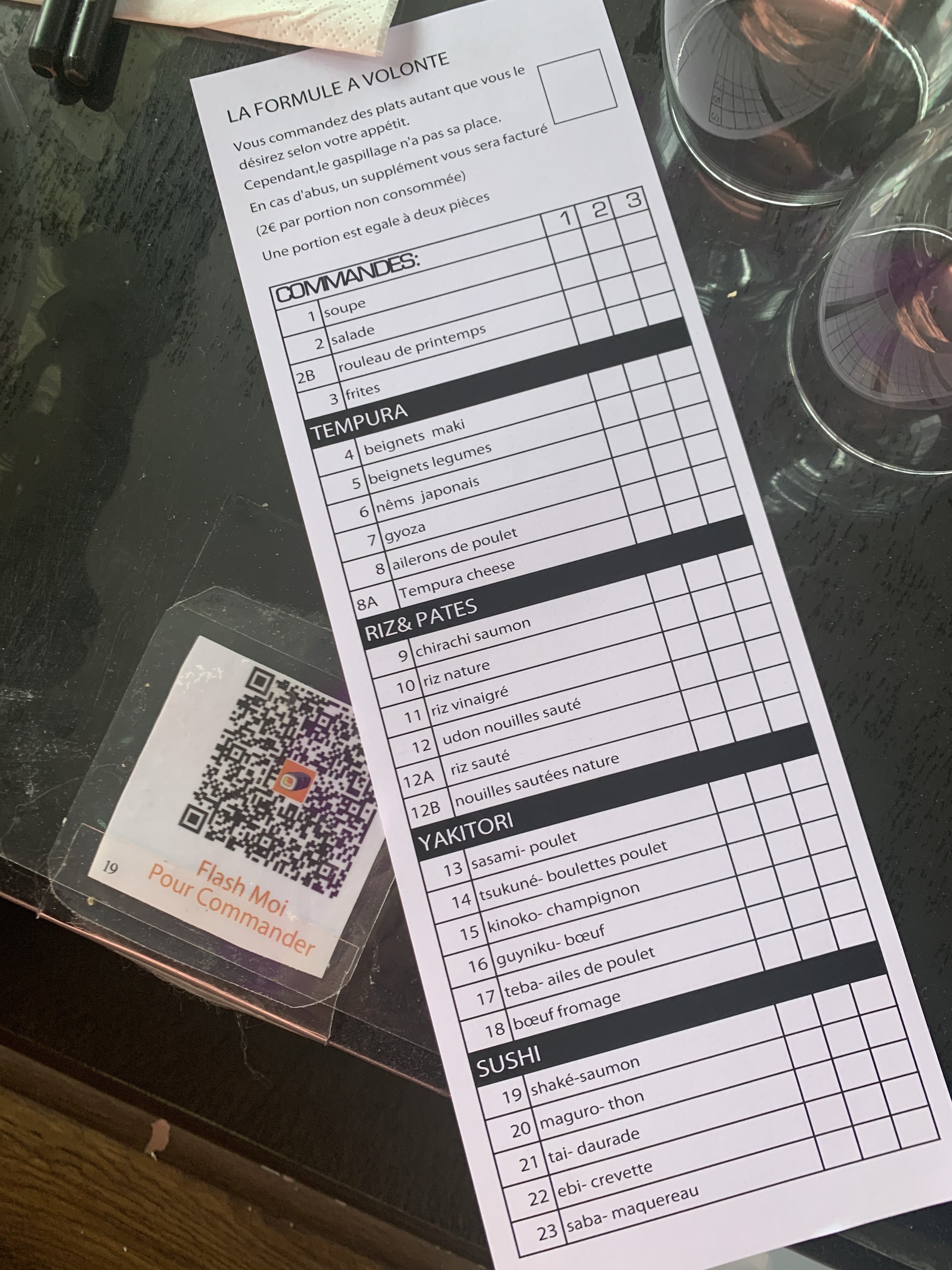 Commender est une vraie torture, revenez à un mode de commande plus simple !!! Malgré tous la cuisine reste modeste mais le prix est 4 € au dessus de la norme !!! On mange parfois bien mieux dans un sushi volonté à Paris à coût bien plus bas. Réfléchis sera avant de venir dans ce restaurant.