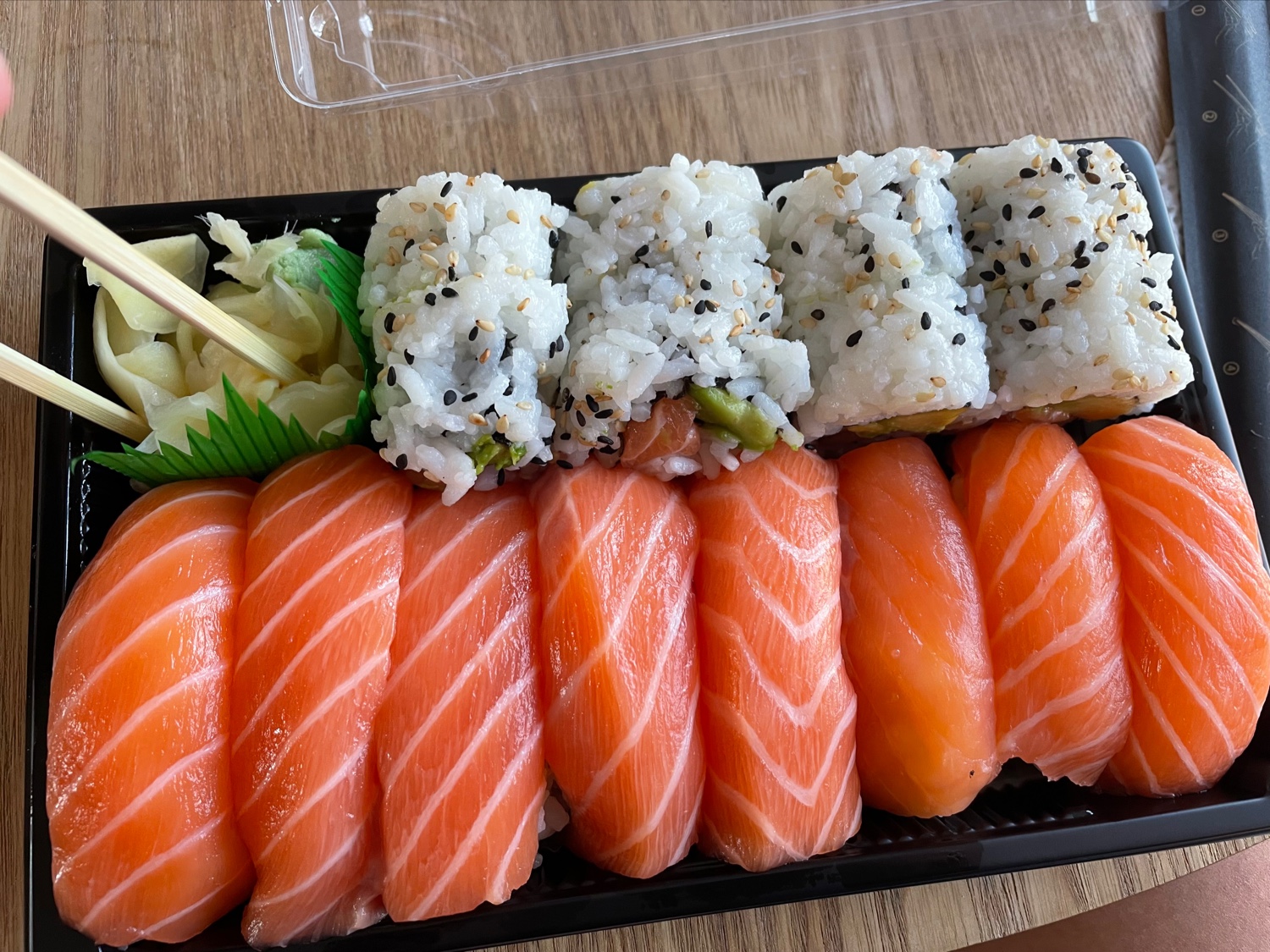 Très bon: on a goûté les makis thon et saumon et les California, avec des nems au poulet, de la salade de choux et en apéro on a découvert des cacahuètes enrobées de wasibi, c'était vraiment très bon on a tous adoré ! PS: dommage qu'ils ne proposent pas de gyozas 😜