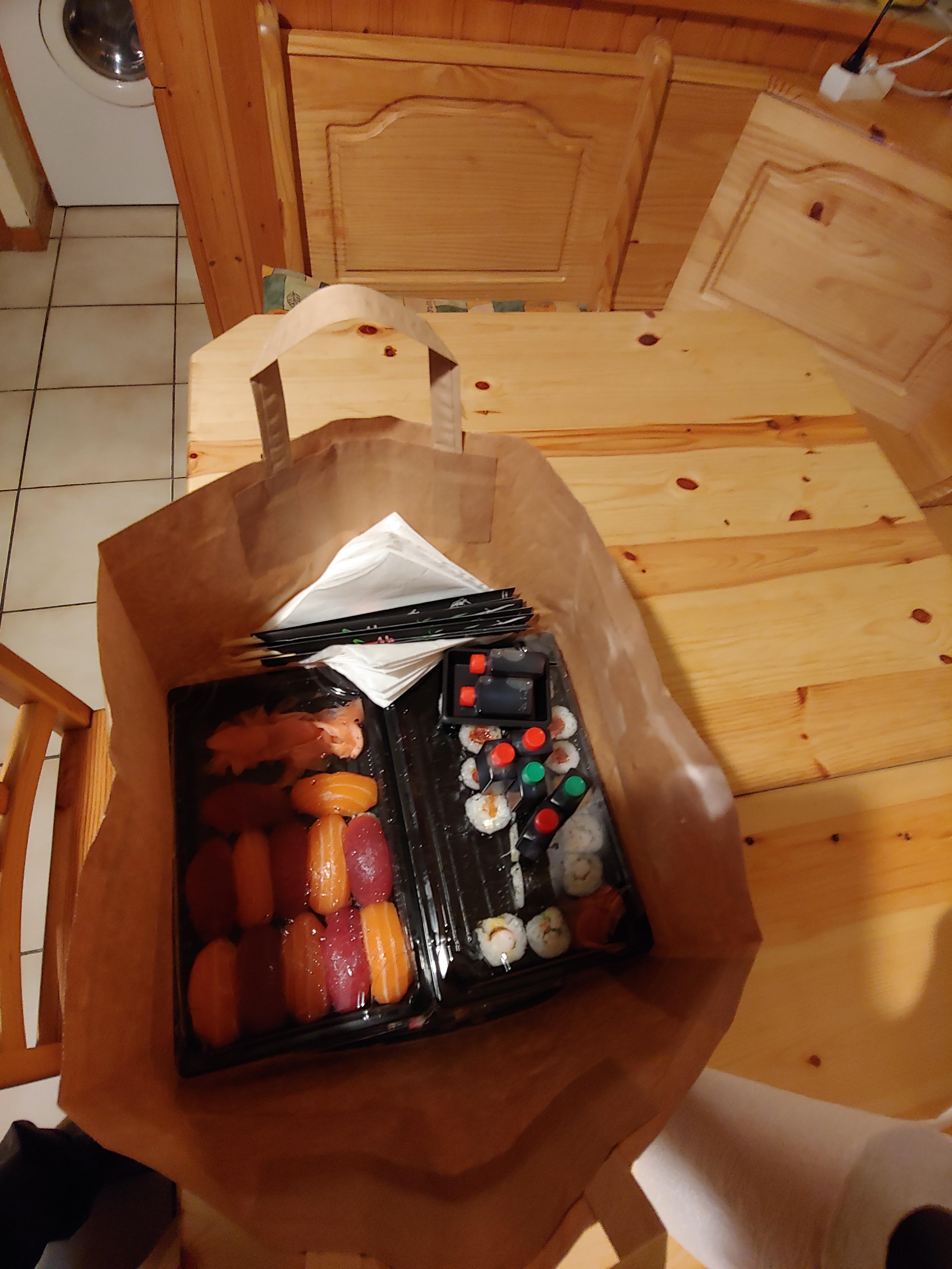 Commande pour 21,70€... Les sushis sont ultras petits, mal fait.. l'un d'entre eux ne contient quasi même pas de riz (voir photo)... Très déçue pour le prix. Quant au goût.. les sushis saumon fromage frais sont fades.. dommage...