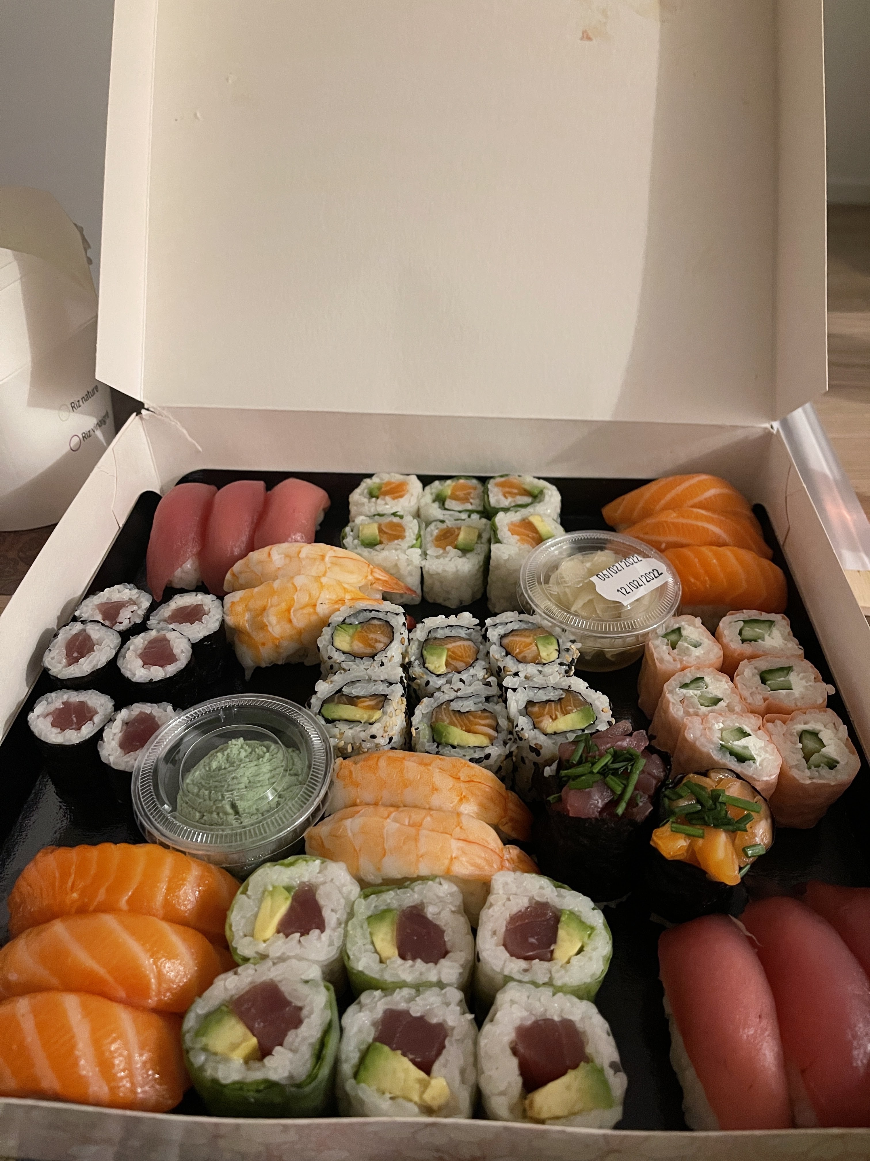 Les sushis étaient bons et la livraison rapide. Par contre nous avons été bien malades derrière… nous avons un doute sur la fraîcheur du saumon thon et crevettes que nous avons mangé 😅