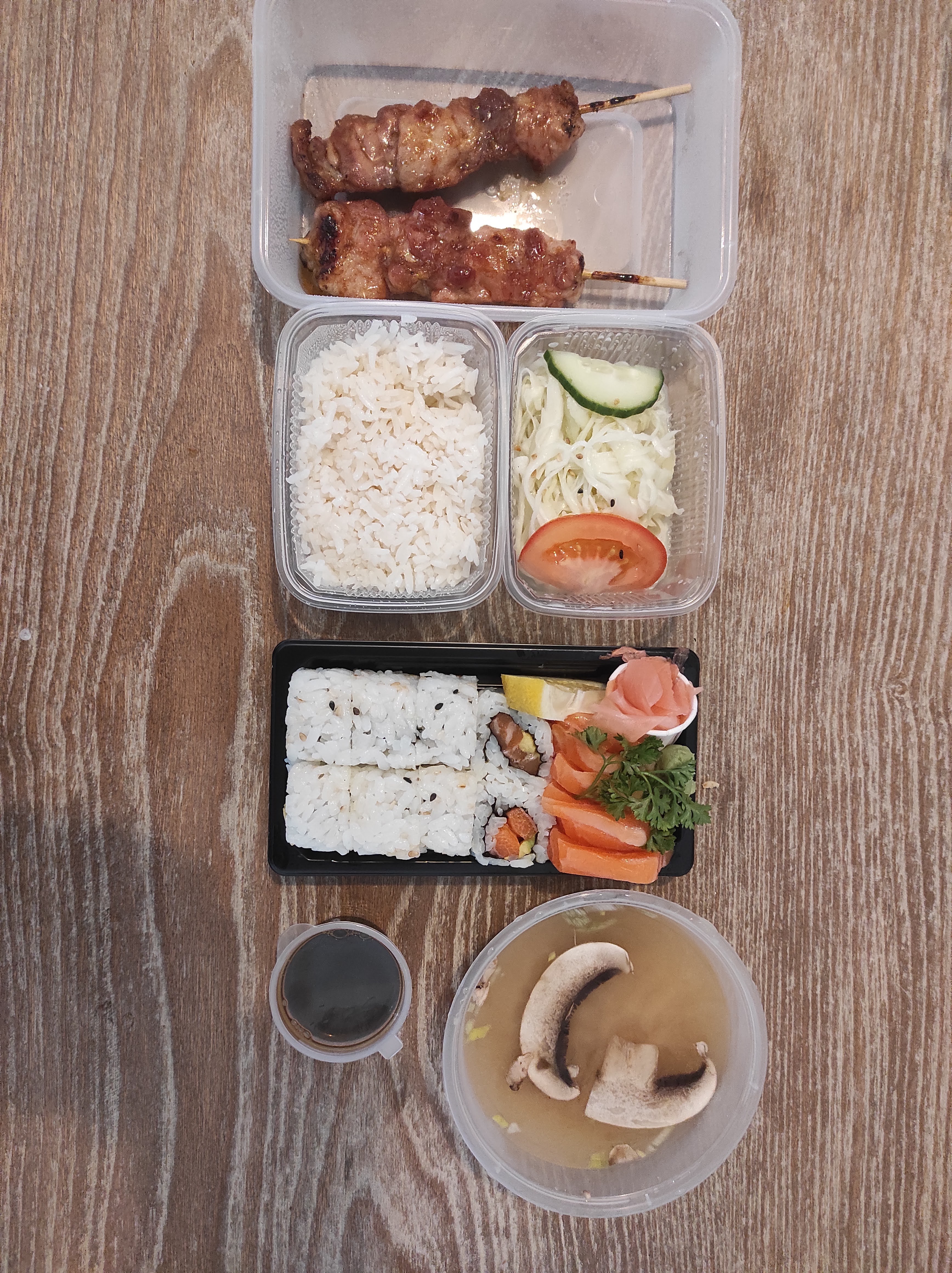 4/5 🌟 le midi, à emporter, menu midi 1, 9.90€ Des plats frais et bons ! Service rapide et portion de bonne taille. Les brochettes de poulet étaient bonnes, du poulet juteux. La salade et la soupe miso étaient fraîches ! Le sashimi de saumon était bon, du saumon frais. Le rouleau californien était également bon, le riz et l'avocat étaient bons. Heureusement surpris !