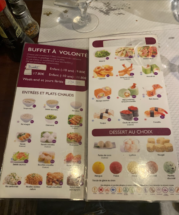 Grosse déception. Je ne le recommande absolument pas ! Les sushi maki etc sont servis par 8 histoire d’en recommander le moins possible, ils étaient pas bons, tellement pas frais qu’ils ne tenaient pas ! J’ai payé une formule à volonté 18€ pour n’avoir le droit qu’a UN seul dessert, personnellement j’ai jamais vu ça. J’ai prit des perles de coco infâmes car bcp trop cuitent et mon ami qui a prit des leetchi en avait 5 dans son vol 5 !! Bref à part les tempura crevette qui sont pas mauvais, rien ne va !
