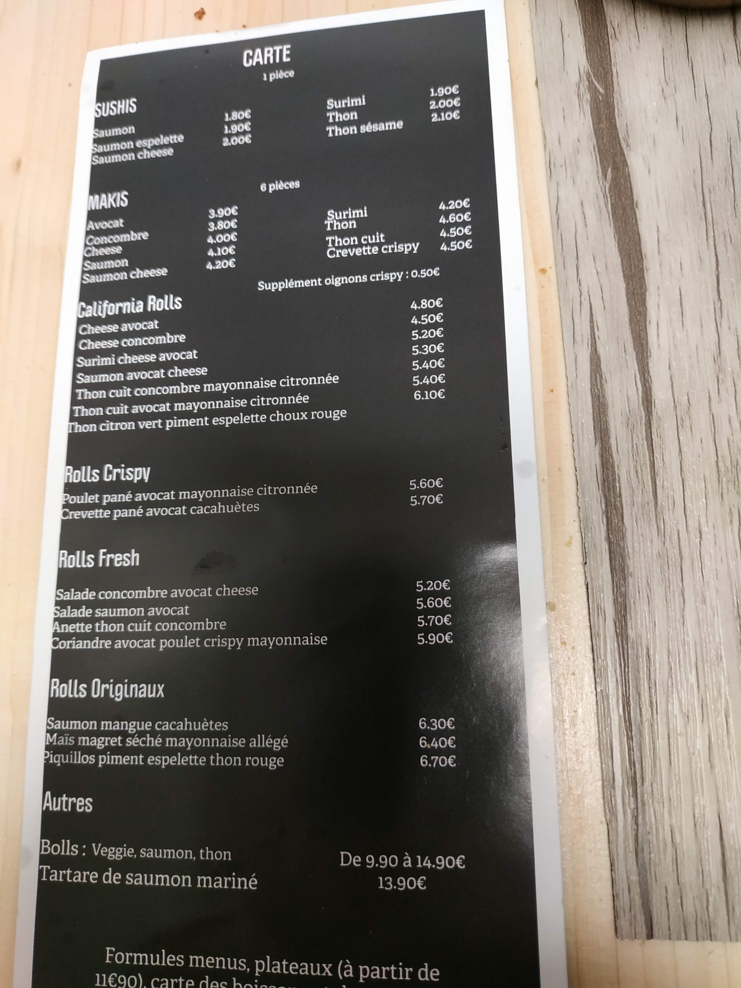 Amateur de sushis je recommande à 100% produit frais qui se ressent en bouche , propreté des lieux irréprochables je reviendrais !