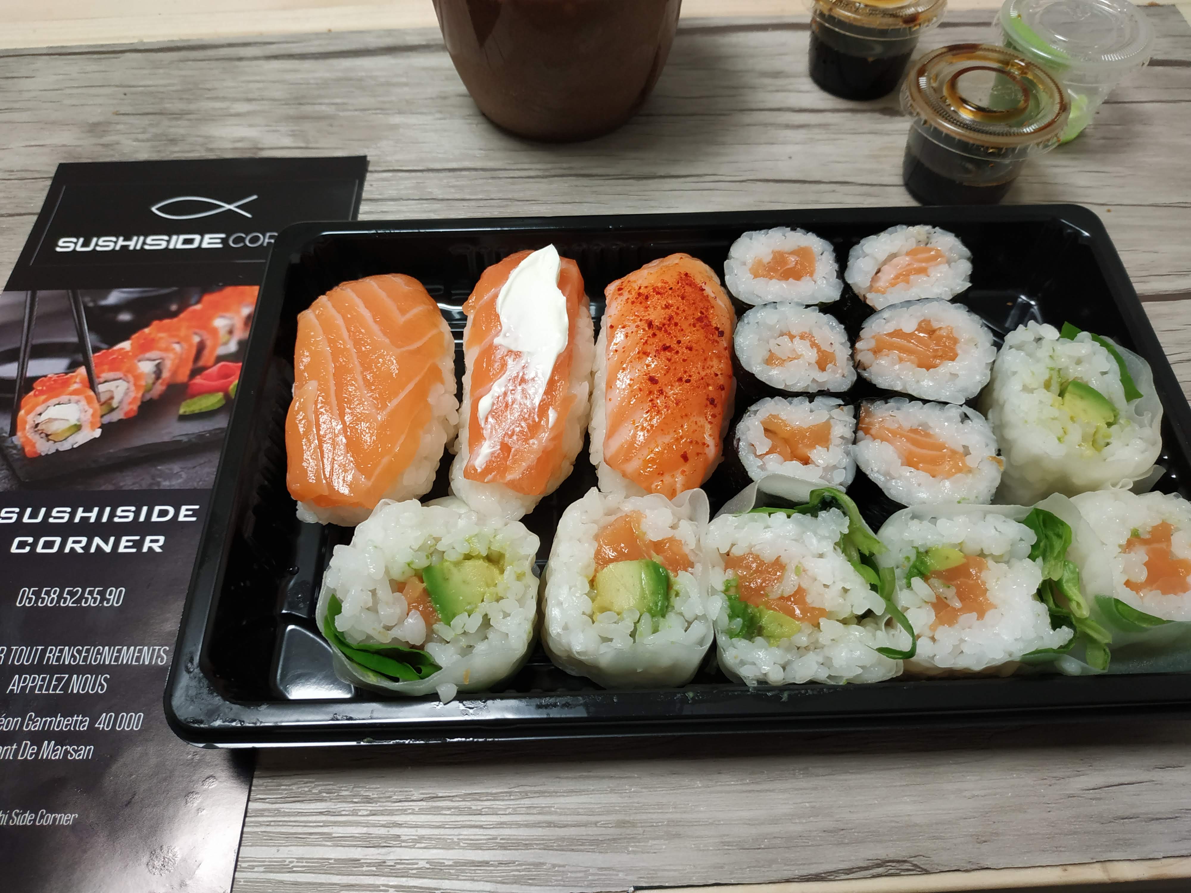 Je ne recommande réellement pas sushi side corner , produits pas du tout frais , ça sent le frigo et goût de frigo , poisson avec un goût bizarre, je doute réellement sur la date de péremption des aliments et la conservation de la fraîcheur , attente beaucoup trop longue je n’y retournerai pas ! A fuir