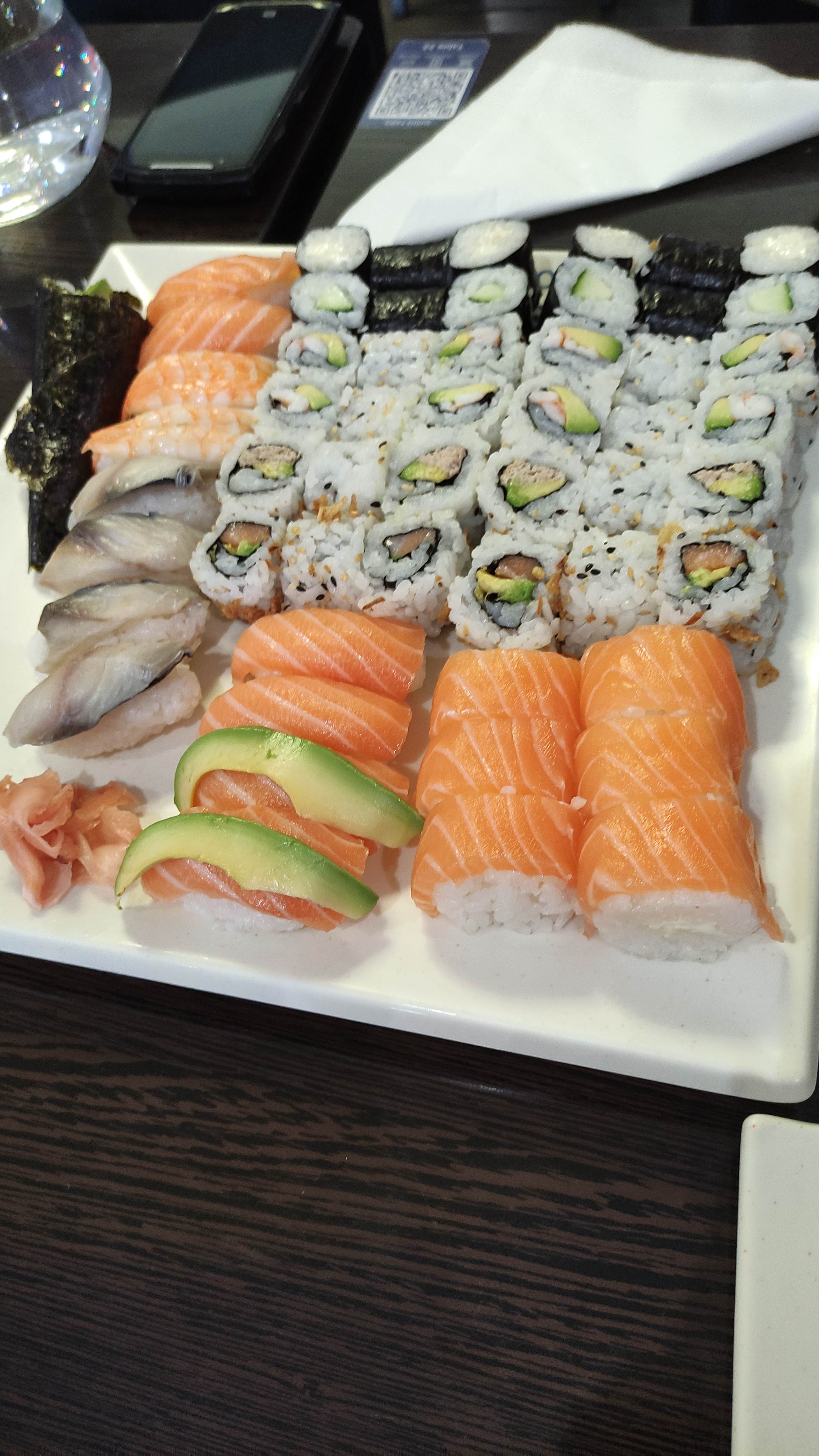 Un restaurant sympathique il utilise le QR code pour les menus et pour passer les commandes. Un petit bémol sur certains points comme les makis qui sont un peu light en poisson. Et si vous souhaitez de la sauce supplémentaire ou du gingembre il faut en demander à chaque fois car il y en a très peu dans les plats. La salle est très agréable et les toilettes sont propres.