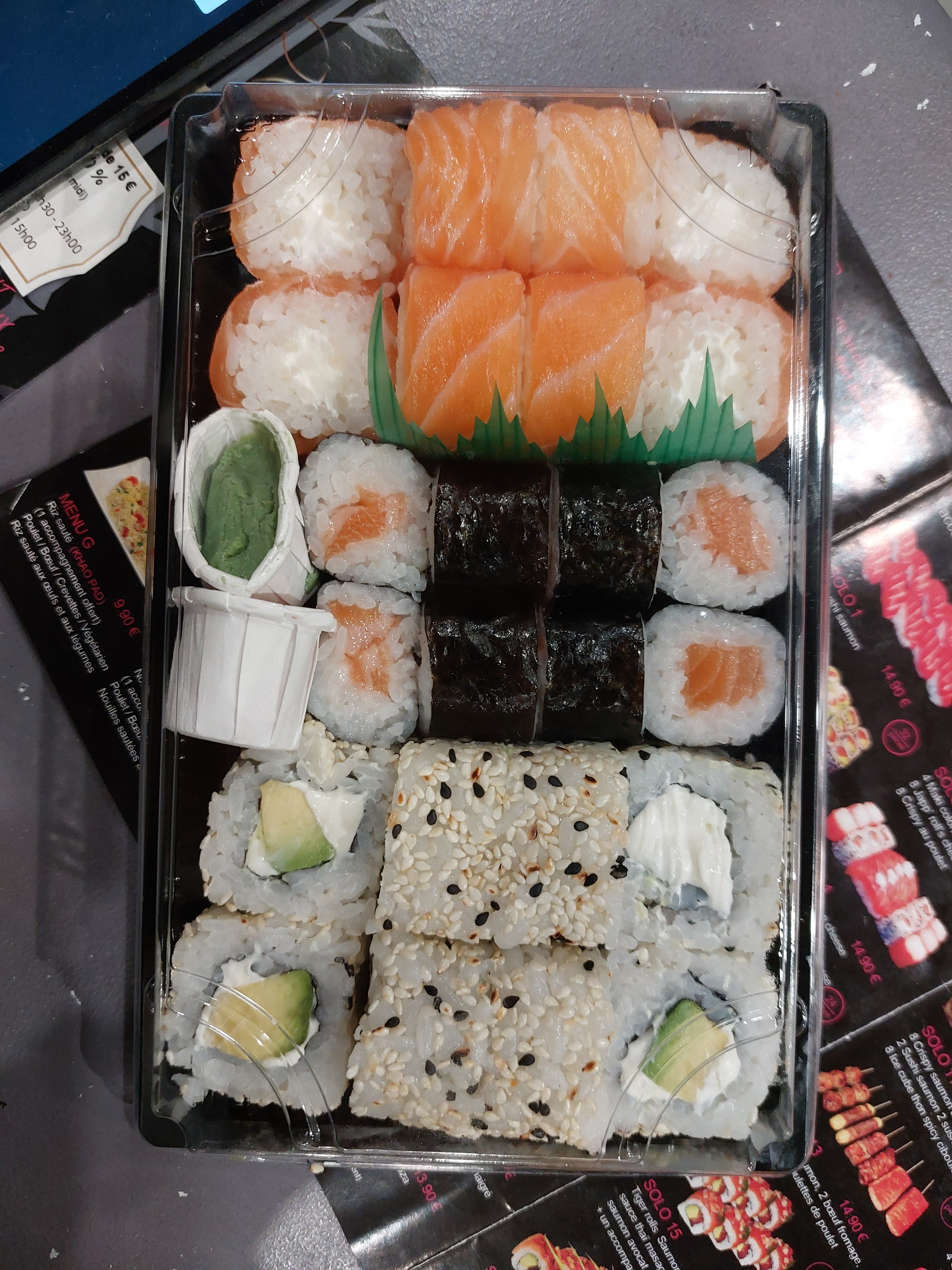 Commande en livraison, reçu assez vite, âpre la qualité des california n’est pas top, trop de riz et trop collant, vraiment pas aimer, le fromage n’avait pas de goût, bref assez déçu !!! Je ne conseil pas